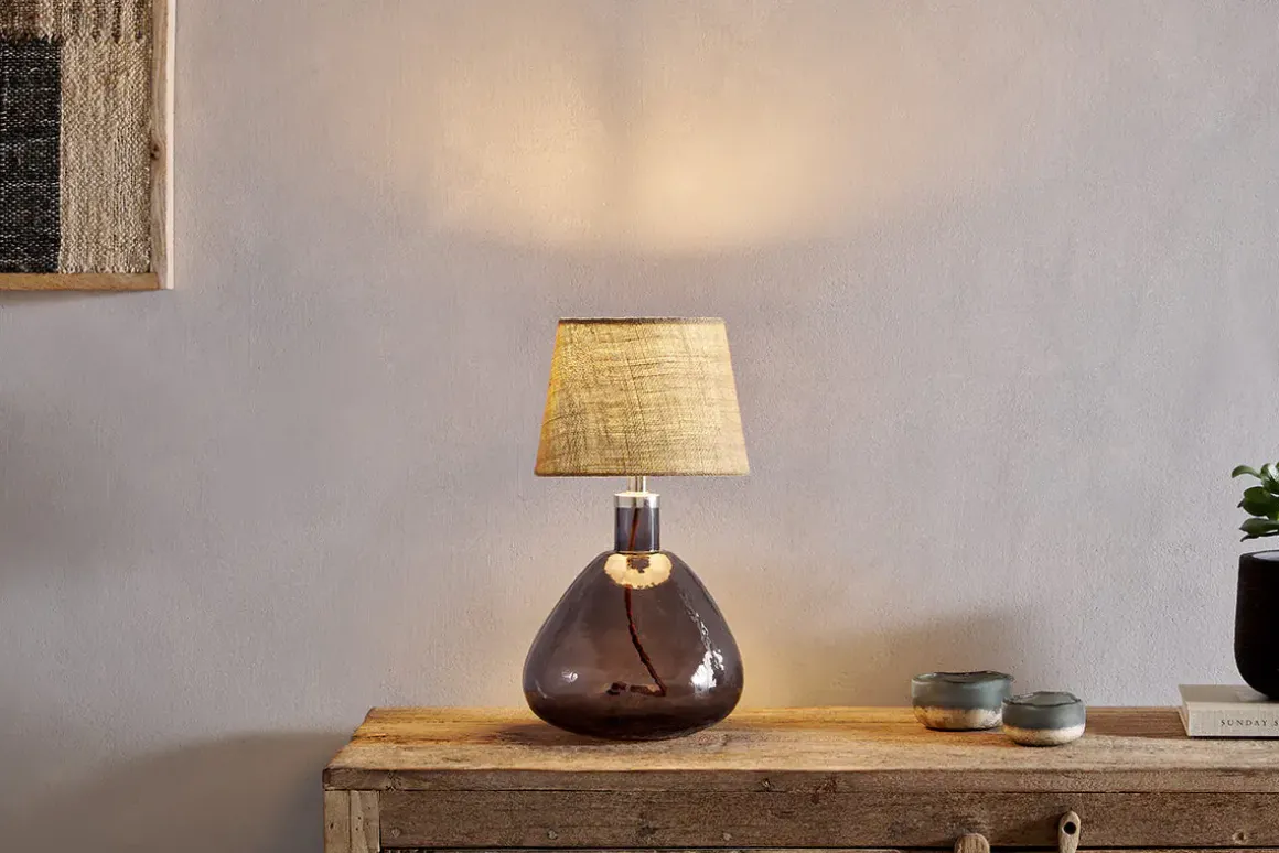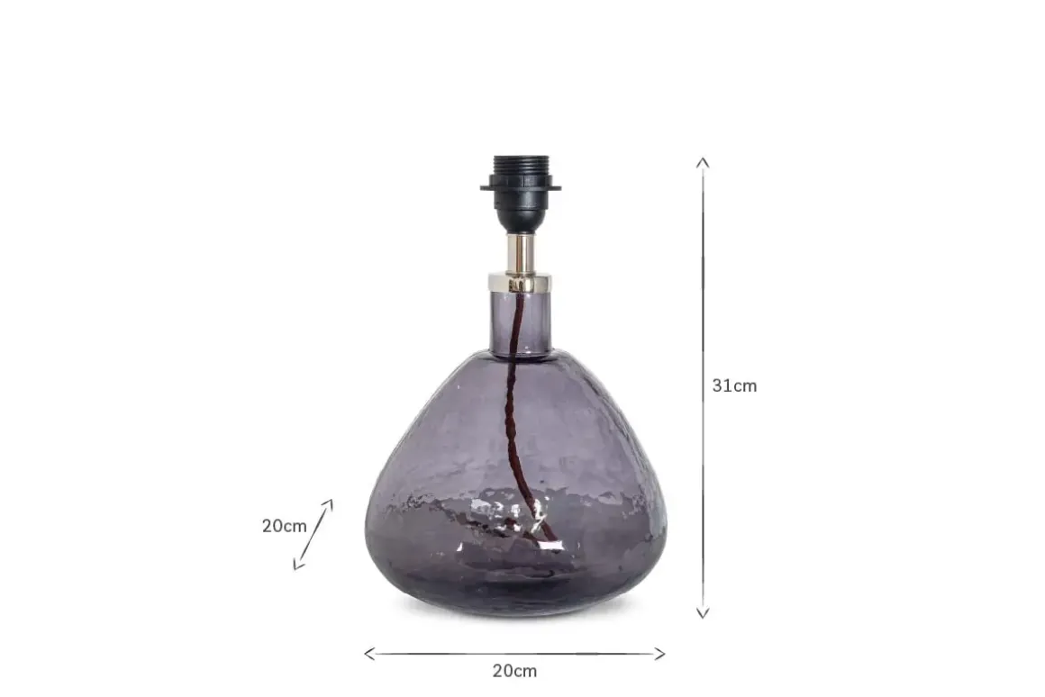 The elegantly curved form of our organic-shaped Baba table lamp is skilfully crafted from recycled glass with a soft, textured hammered finish. This is a statement piece that adds natural, welcoming warmth to your home, whether placed on a sideboard, an entrance hall table, or by your bedside for a unique ambiance. The smoky hue of this lamp base enhances the rest of your furnishings and looks beautiful when styled with a Dia jute lampshade to complete the look.