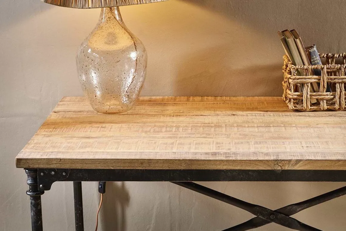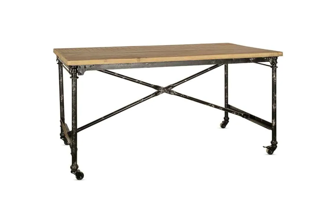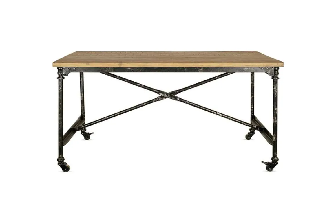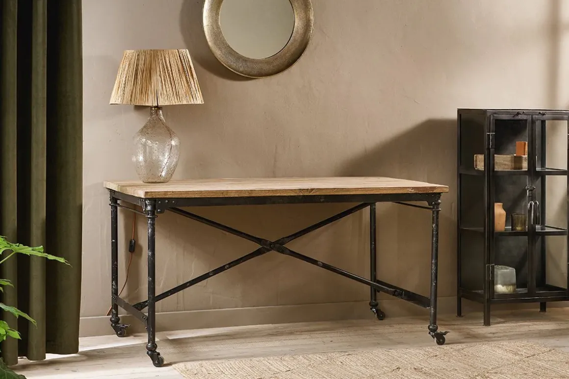This versatile desk combines sustainable reclaimed wood with classic black ironwork to create a sublime rustic look. The reclaimed wood top brings texture and character, with distinctive marks from its previous use. An eye-catching criss-cross detail adds further interest and gives the desk a stylish utilitarian feel. The addition of locking casters means the desk is easy to move while its generous surface area provides ample space for a laptop and other belongings, making it as practical as it is beautiful.