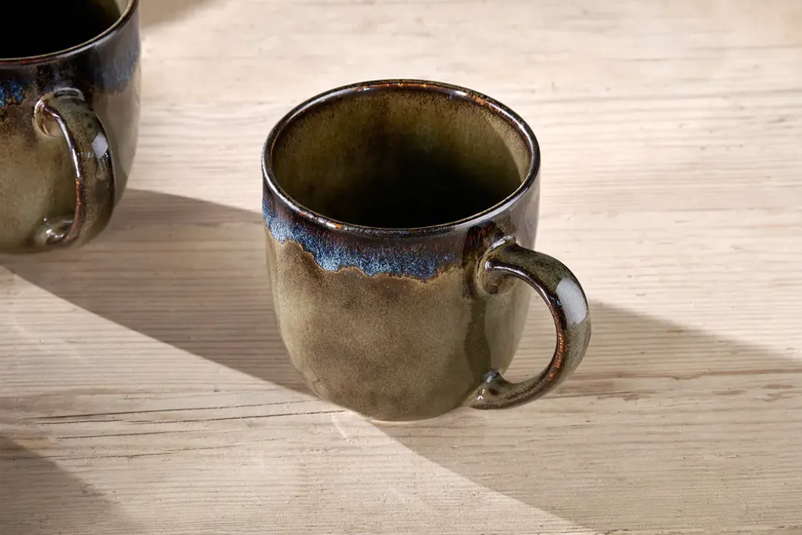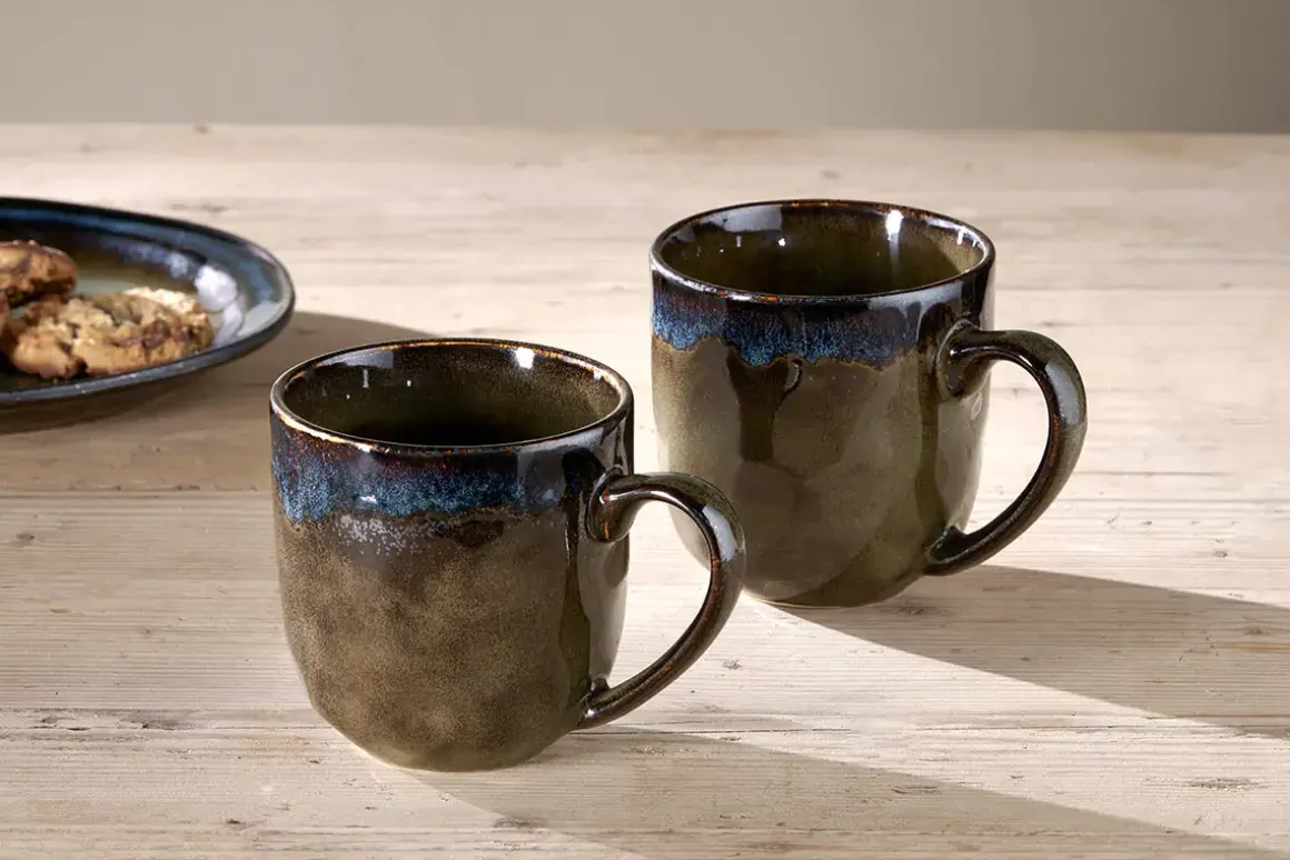 The classically simple design of these ceramic Cali mugs are given a rich, warm aesthetic with an eye-catching glaze that reacts in the kiln to bring out earthy bronze and rock-pool blue hues. Each piece is unique thanks to variations during the firing process. Perfect as generous, everyday mugs with a striking colouring gives daily tea and coffee the feel of a special occasion. For a sophisticated table setting, style with the rest of the Cali collection.