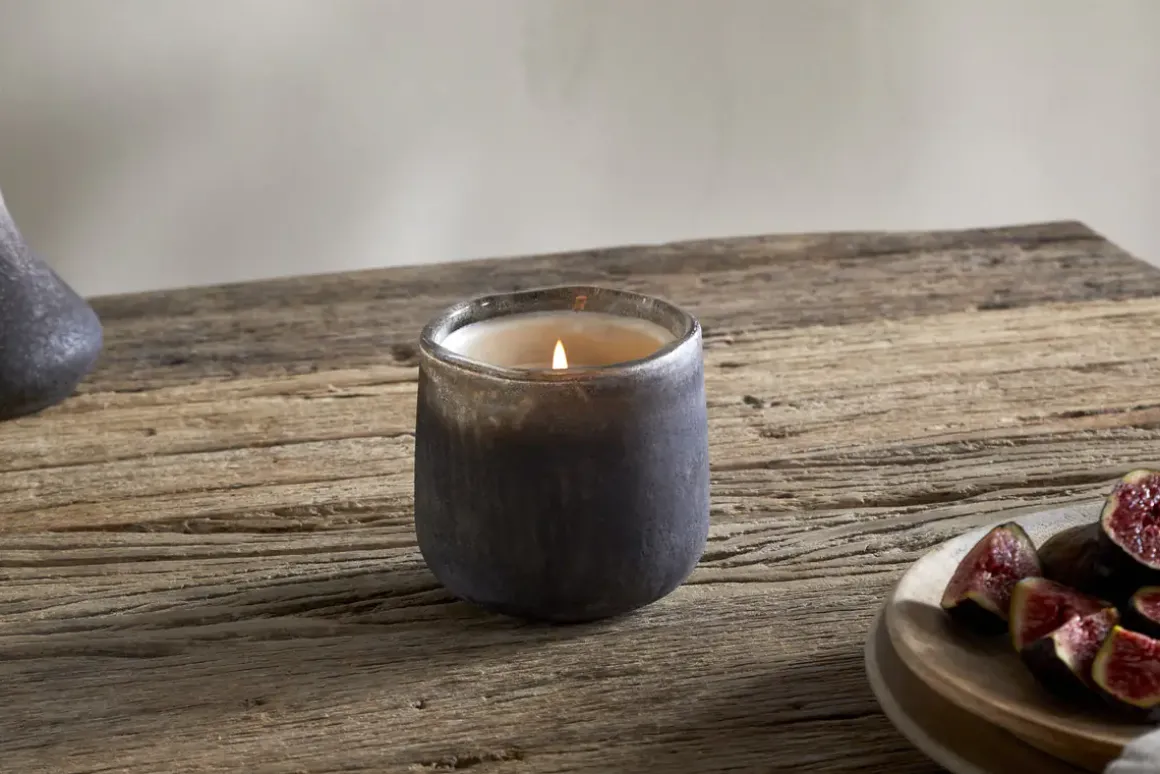 This scented candle is made in the UK by a family-run business, using a bespoke fragrance created exclusively for Nkuku. Woody notes of cedarwood, aromatic smoke, and honeyed fig evoke the warmth and comfort of a crackling fireside. The vessel is finished in one of Nkuku’s iconic textured styles and intended to be reused once the candle has burned through.