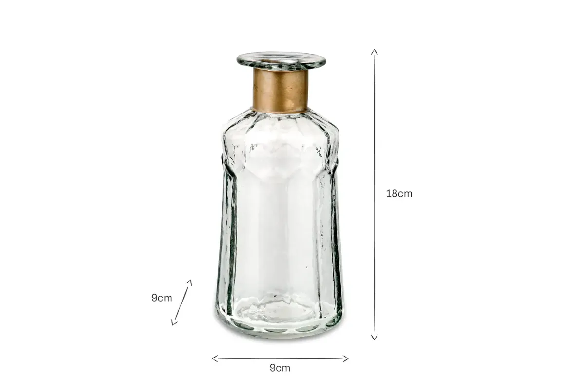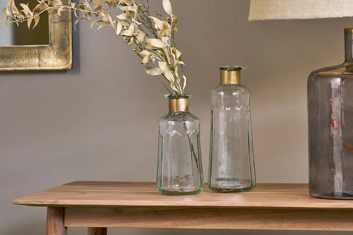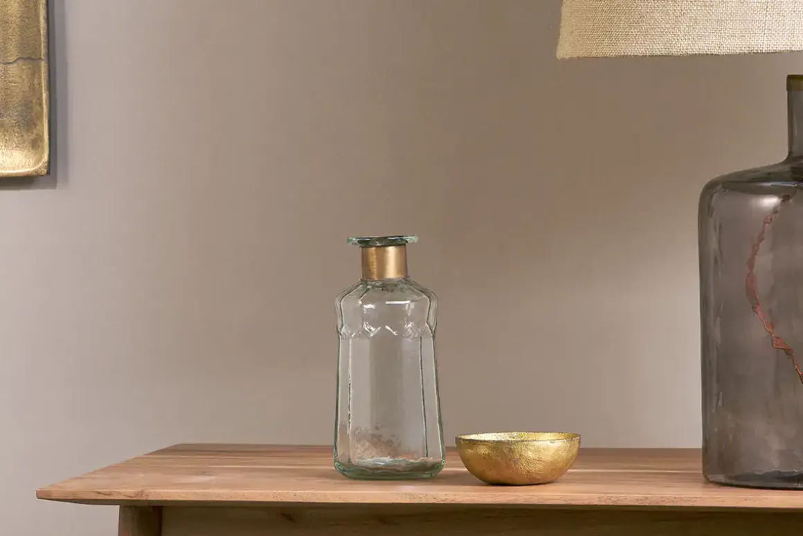Our Chara bottles are full of sophisticated rustic charm; these artisan made pieces involve hammering the glass with traditional tools providing a subtle textured affect. The glass is skilfully blown through the brass ring creating this elegant shape. Solder marks are often evident on the brass as a result of this complex handmade process.