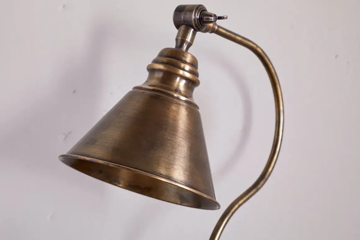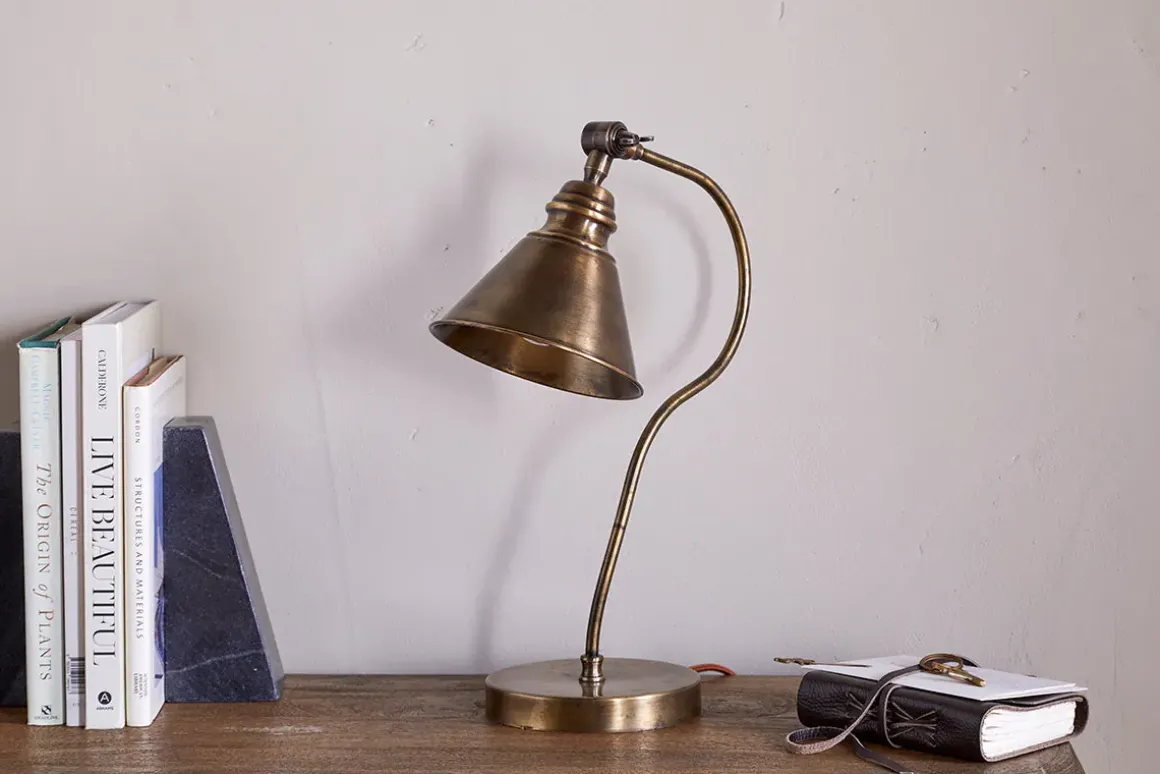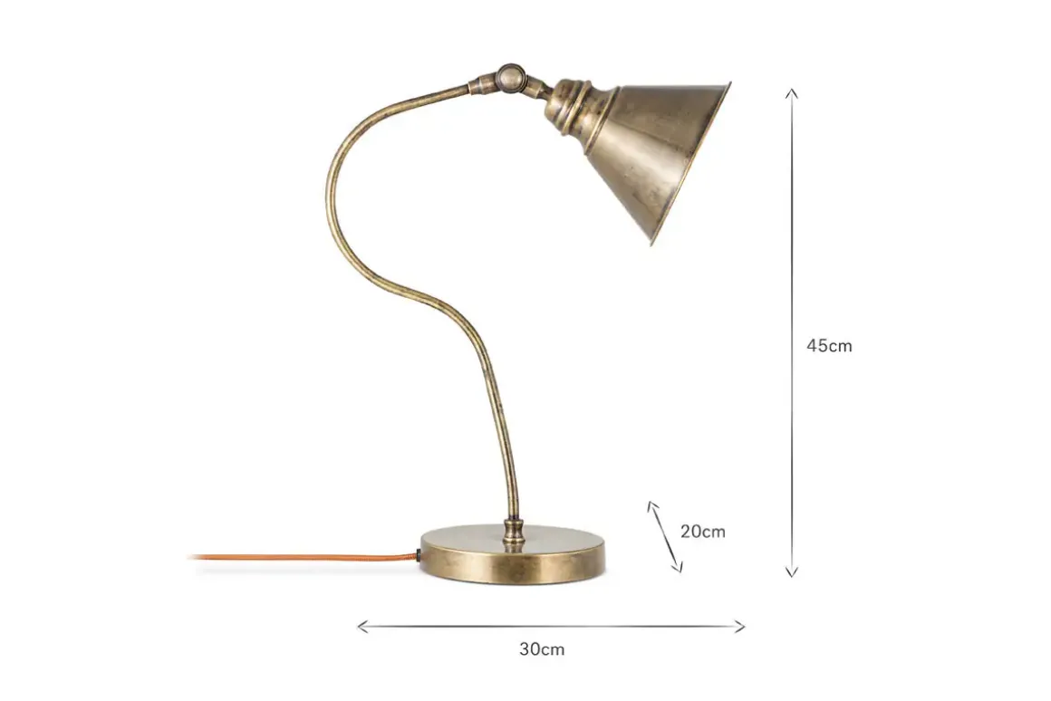 This antique brass Damba desk lamp has a classic silhouette, elevating an office space with its simple yet timeless look. The conical shade can be angled to create a pool of directional light that is perfect for illuminating work even if the lighting in the rest of the room remains low – ideal for desks that occupy a mixed-use living space. Its petite footprint makes it great for small spaces. Please note lighting does not include bulbs.
