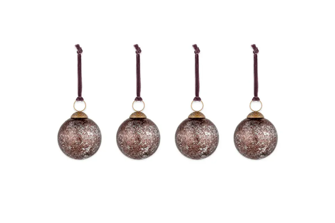These indulgent antique burgundy Darya Baubles bring a touch of elegance to a sophisticated festive scheme. Made from recycled glass that has been mouth-blown into beautifully patterned moulds and given an aged patina for the truly timeless look and feel of heirloom pieces. These are an ideal bauble for creating a striking backdrop on a tree and would be beautifully offset with small Sardi gold stars. Finished with an antique-style clasp and elegant velvet ribbon.