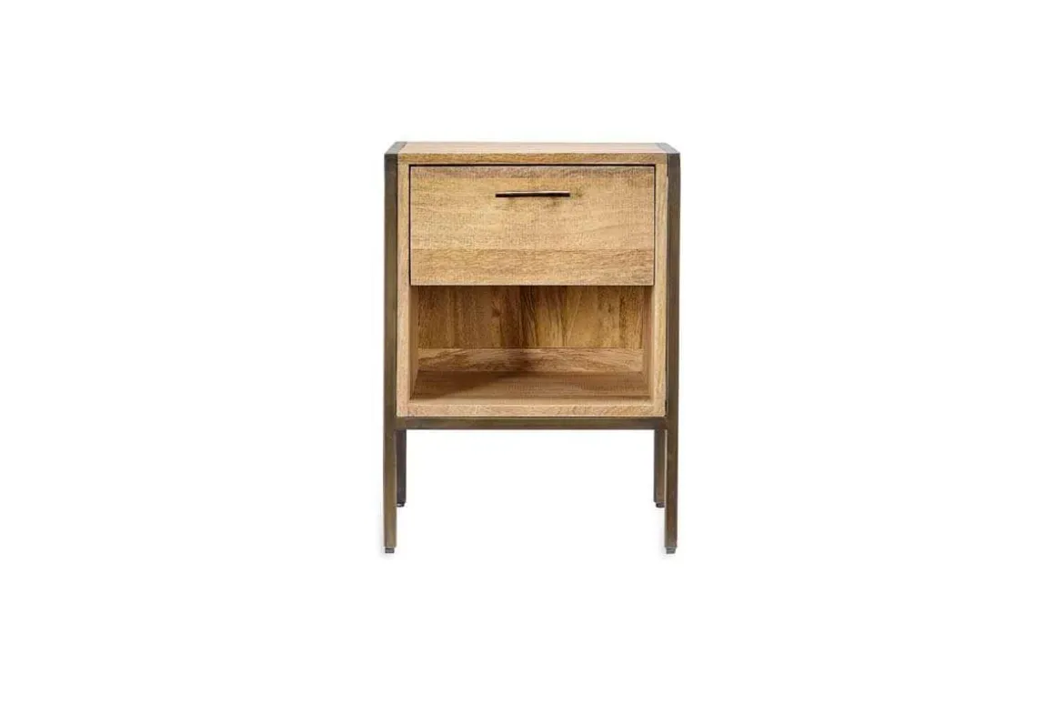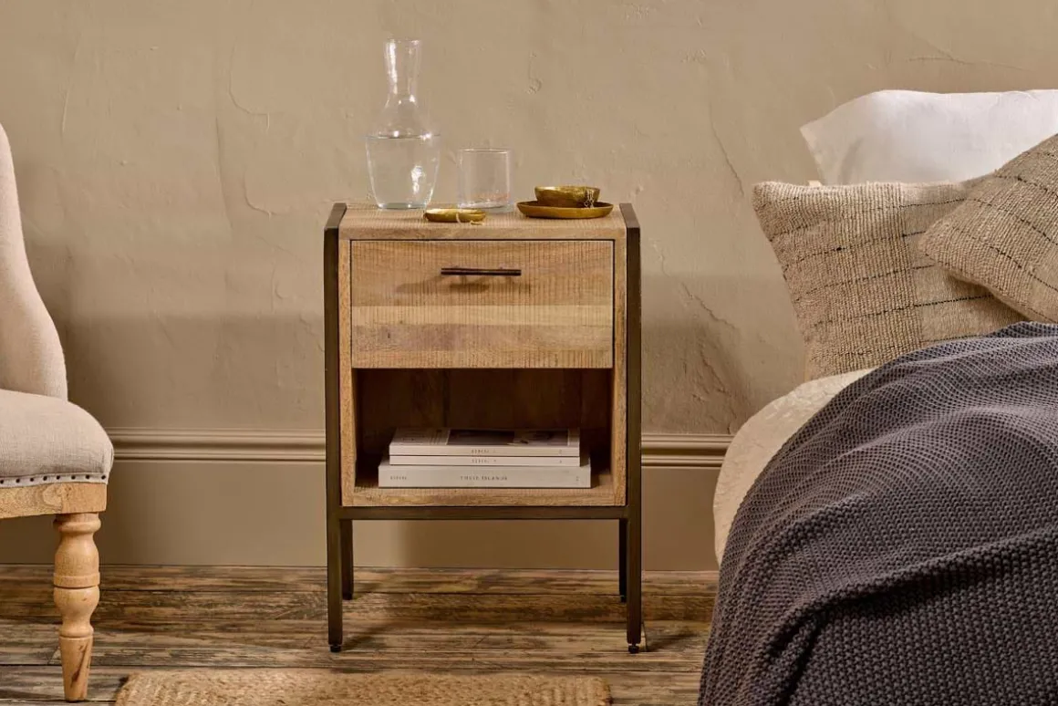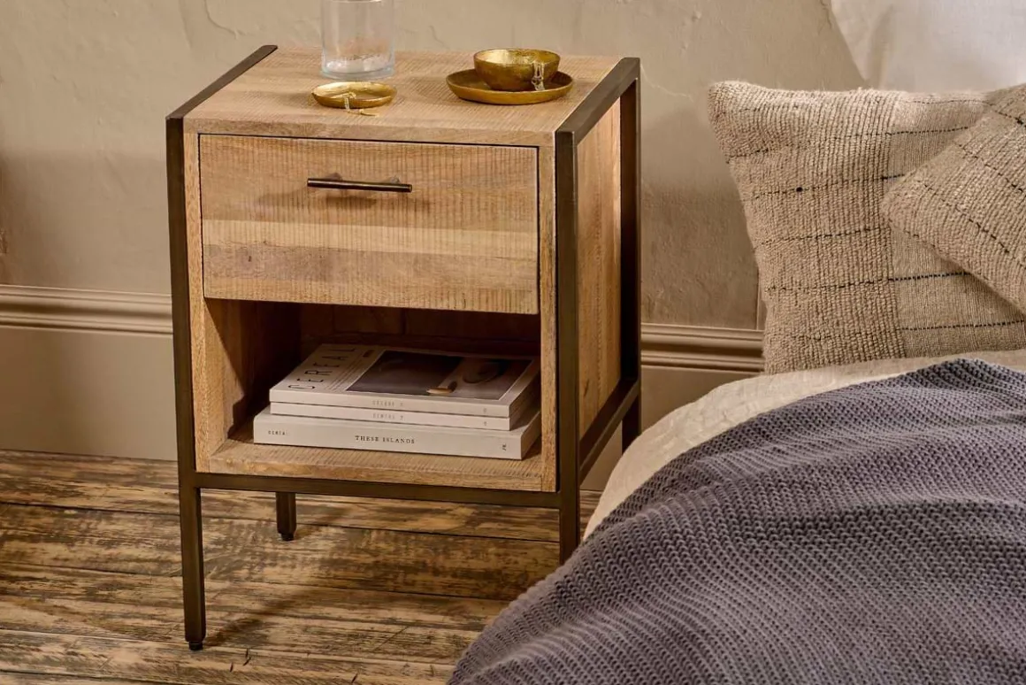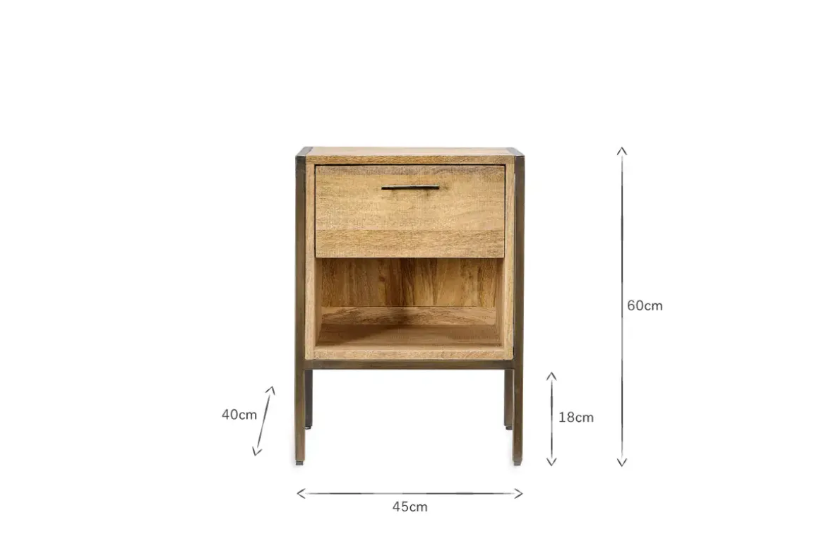 This perfectly proportioned bedside table is handcrafted from natural mango wood. It has a simple iron framework that gives it a contemporary feel with a single draw and lower cubby shelf that’s ideal for storing books. We love the simple iron drawer pull. Style with a table lamp and clock for the perfect bedside ensemble.