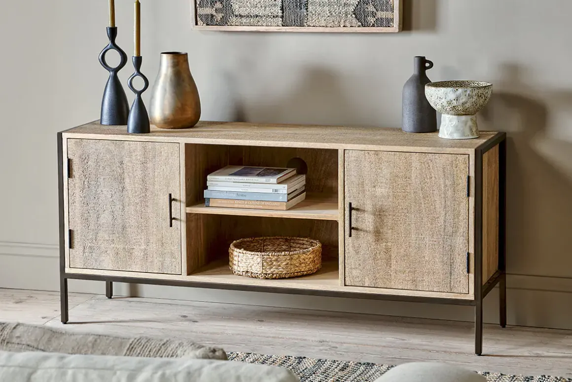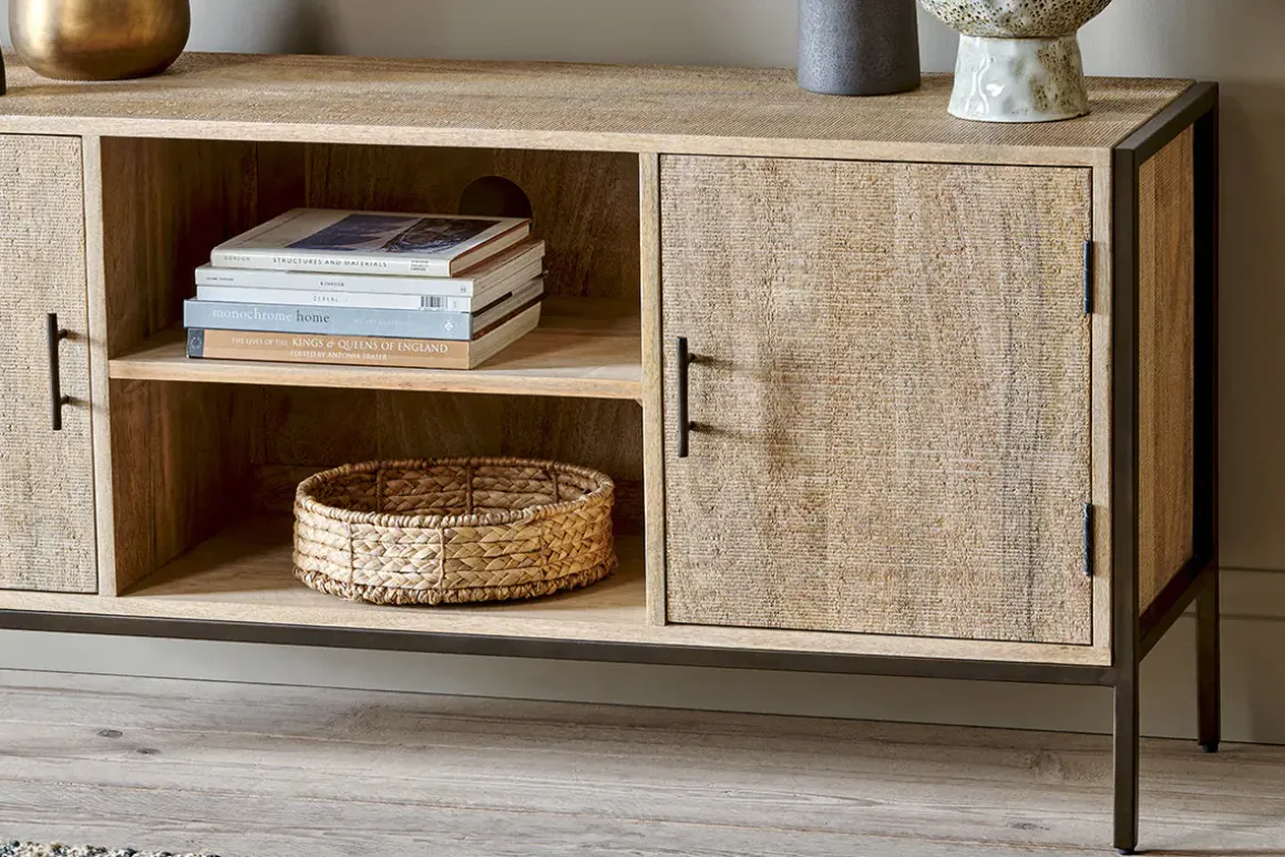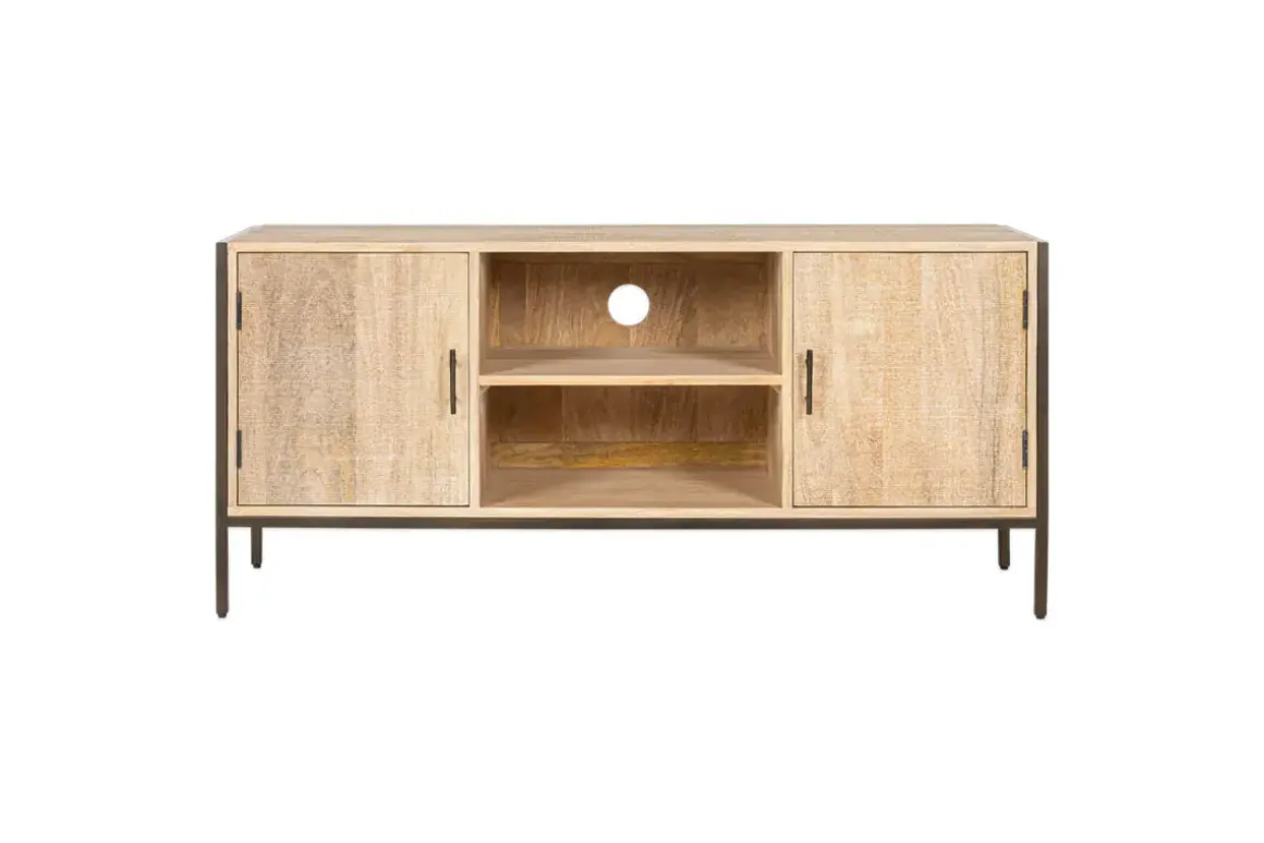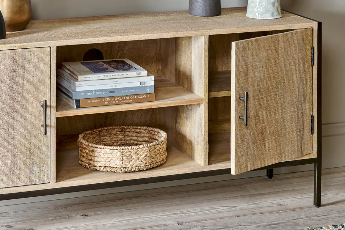 A new addition to our functional Dasai collection, the Media Unit will keep wires, consoles, hubs and controls neatly arranged and out of sight, while looking effortlessly stylish in any living space. Constructed from sustainable mango wood and sand-blasted for added texture to complement the natural grain, while contrasting the dark finish of the solid iron framework. Each cupboard has simple iron handles and comes with a single shelf centrally and on each side. This timeless piece works well as a conventional sideboard but has also been designed as a practical home entertainment console with a discrete access point for cables and plugs.