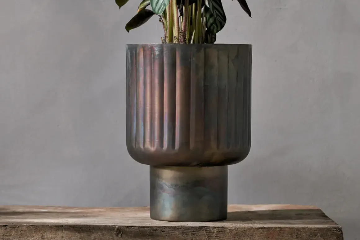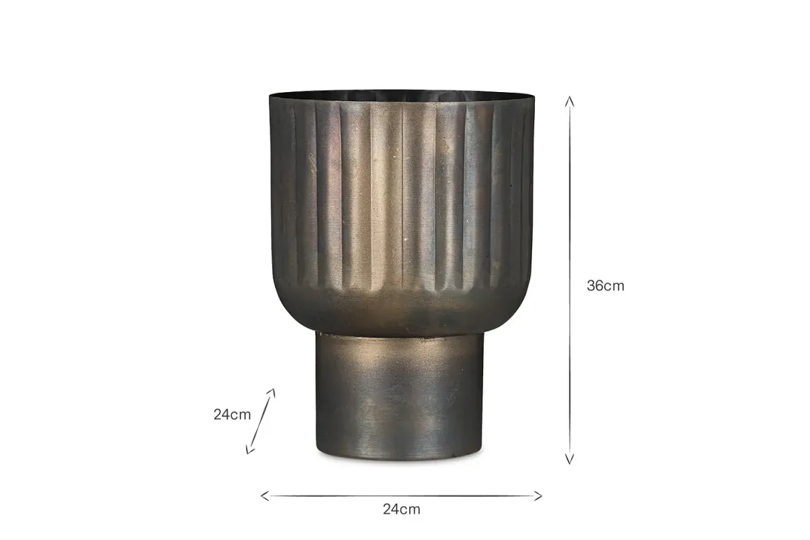 The antique brass finish and architectural form of our Dasalla planter make it a stylish and multifunctional addition to any living space. The etched groove design creates a subtle shadowed detail that brings additional texture to the piece and adds to the unusual silhouette. Whether alone or grouped with others, filled with foliage or empty, on the floor or on a sideboard, this planter creates a wonderful display to draw the eye wherever it is placed.