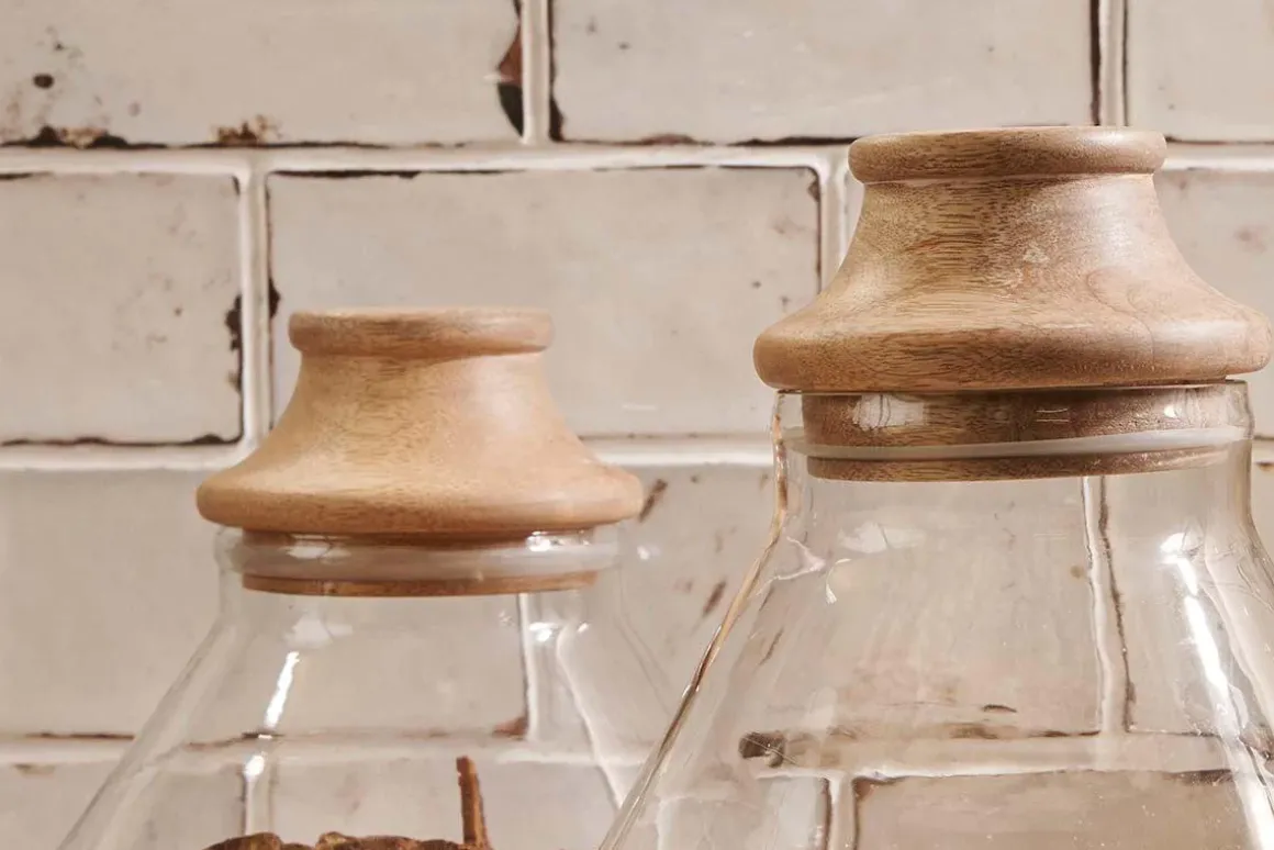 We are elevating kitchen storage to a new high with these handblown glass jars. Their refreshed shape and hand-turned natural mango wood tops combine for a truly elegant finish. Ideal for storing dried food such as pulses and pasta. The mango wood tops are lined with silicon for an air-tight suction seal.