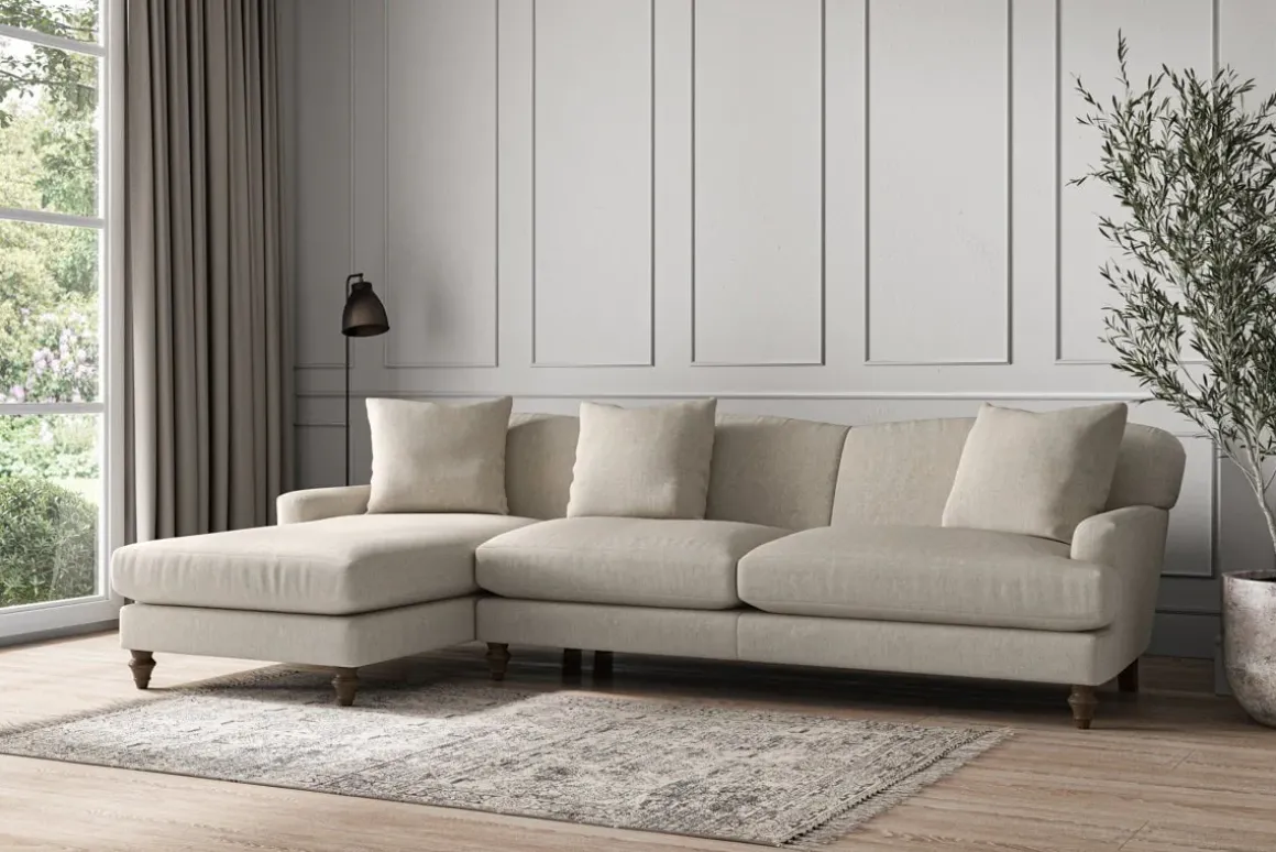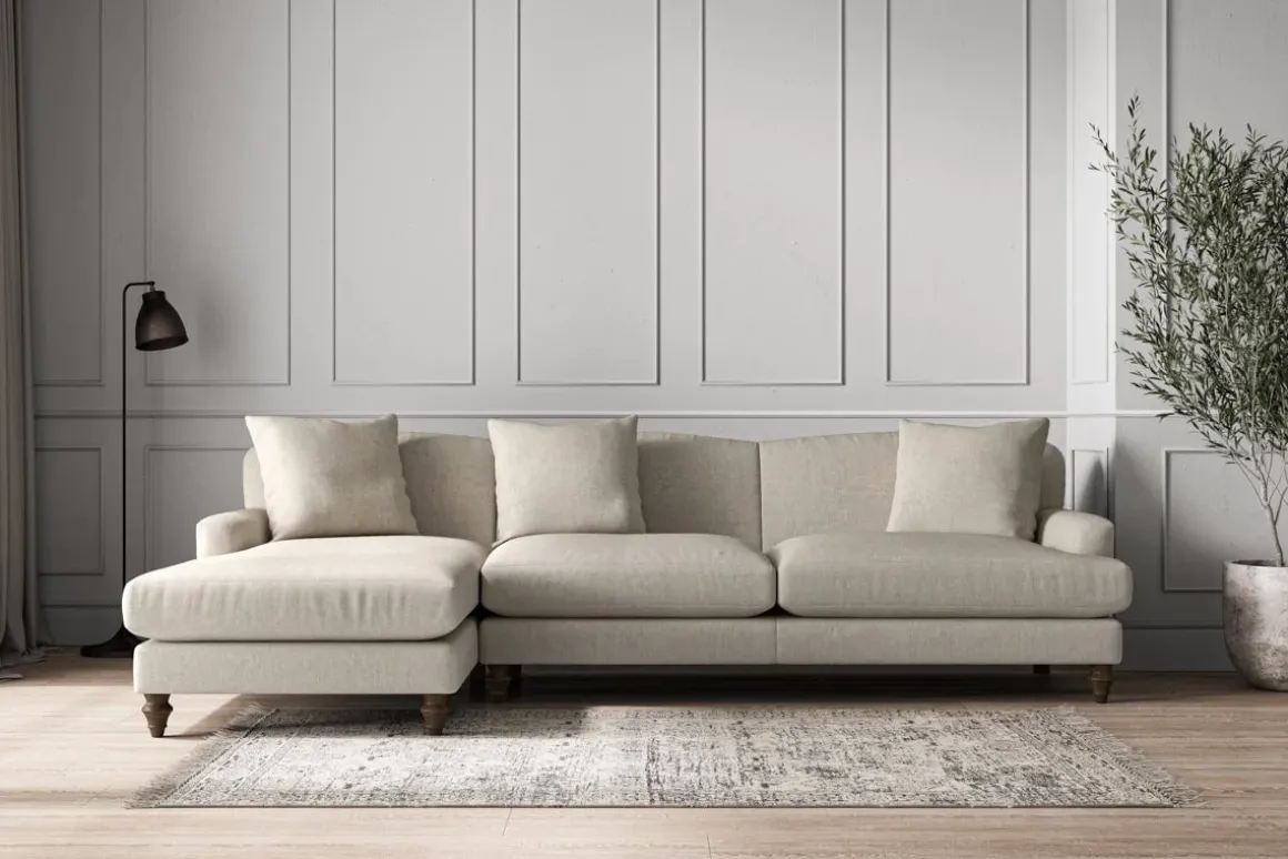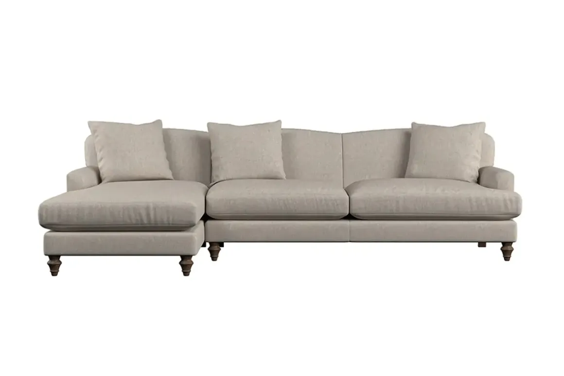 Our Deni grand left hand chaise sofa is generously proportioned with deep, sumptuous seat cushions for luxurious comfort. Handcrafted from a solid hardwood frame with high-grade steel serpentine springs and foam and fibre wrap filling, this timeless collection celebrates the best of British quality and design. Fine details include in-built back cushions, hand-turned hardwood feet and a set of three scatter cushions for added comfort.