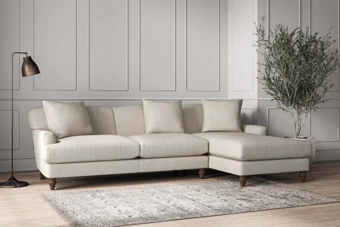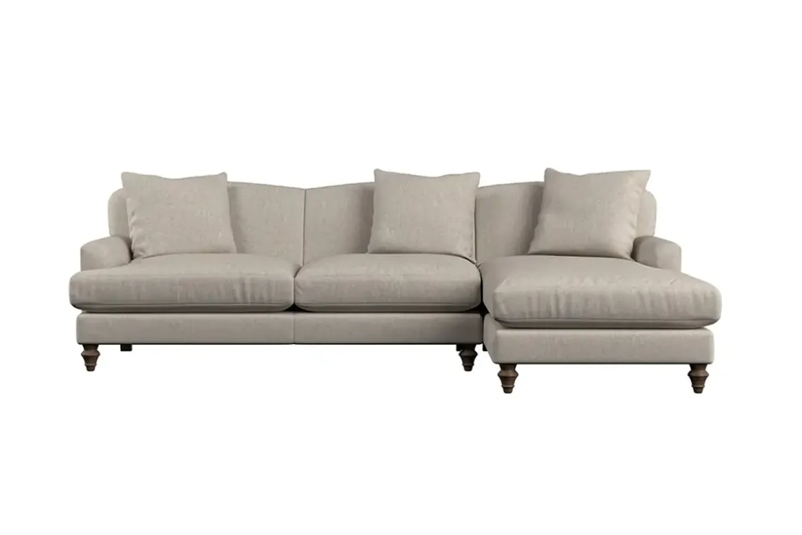 Our Deni large right hand chaise sofa is generously proportioned with deep, sumptuous seat cushions for luxurious comfort. Handcrafted from a solid hardwood frame with high-grade steel serpentine springs and foam and fibre wrap filling, this timeless collection celebrates the best of British quality and design. Fine details include in-built back cushions, hand-turned hardwood feet and a set of three scatter cushions for added comfort.