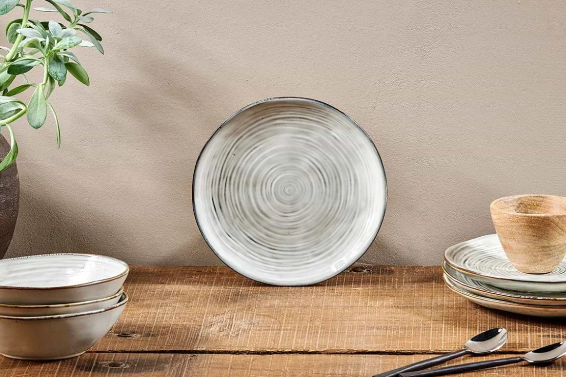 The Dhanuk side plate has an alluringly rustic aesthetic. The subdued palette of soft browns and cream fuse effortlessly together in this appealing reactive glaze. The plate design features a soft ridged swirl that flows around the surface of the plate, adding both a tactile quality and attractive design detail. A reactive glaze blends two glazes together, creating a variegated finish and irregular finish. The brown under colour shows more faintly through the glaze.