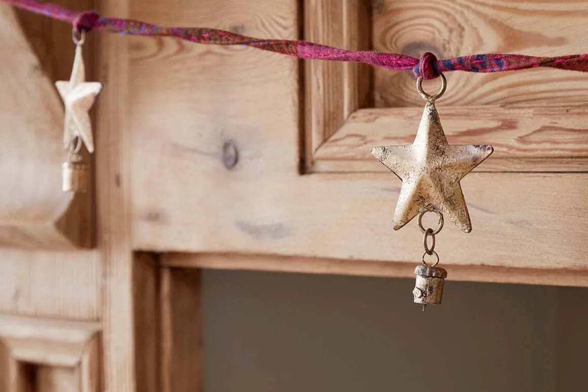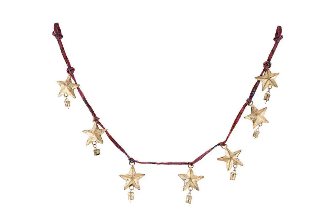 This Christmas garland features a string of handcrafted antique brass stars, each adorned with a small bell to add a gentle chime to your seasonal setting. Strung on a colourful, unique sari tie, it brings a playful mix of texture, tone, and movement to your decor. Perfect for draping along staircases, framing doorways, or adding a joyful touch to your Christmas tree.