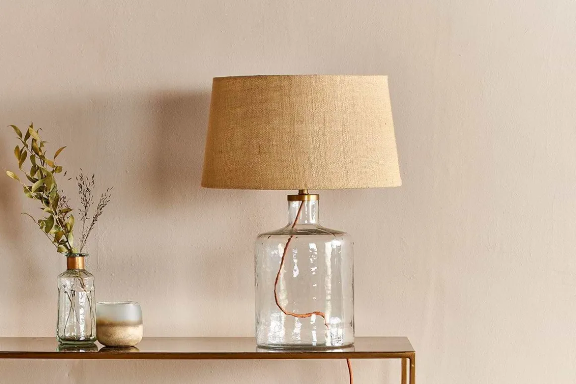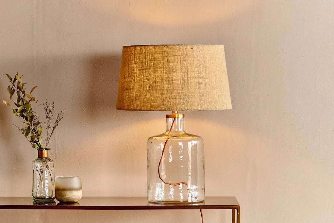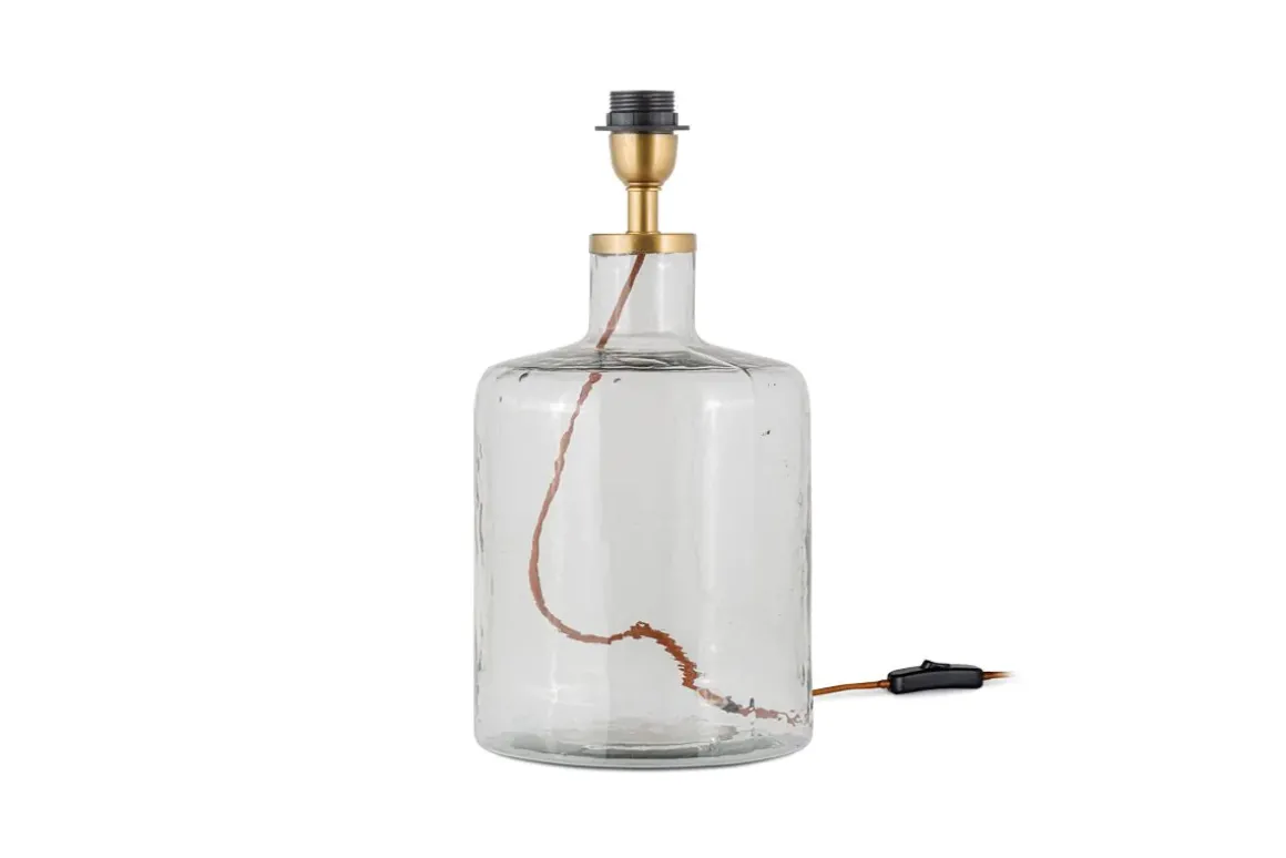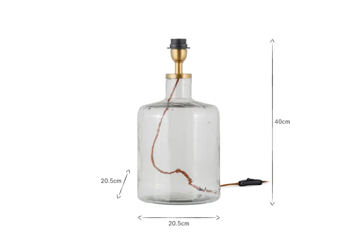 This fresh clear glass Edina lamp has an elegant classic shape. The clear glass feels neutral and fresh and combines effortlessly with the hammered effect of the glass. This tall bottle shape is easy to style in a variety of schemes. A bedside lamp should have a lower wattage to a main pendant light, allowing you to create a cosy relaxed environment to unwind in. Glass is a versatile material that feels fresh and luminous. The Edina lamp is made from recycled glass, mouth blown into this elegant shape. Each one has a fabric rust coloured cable.