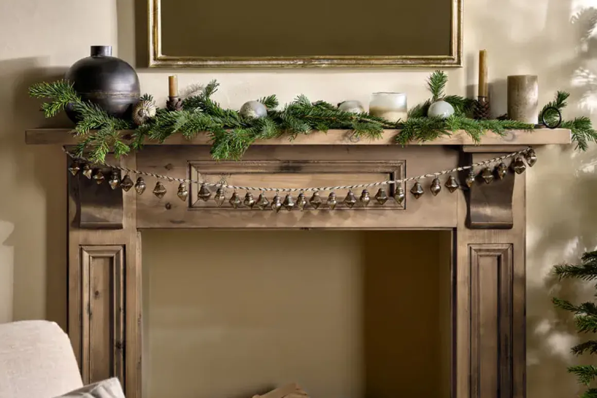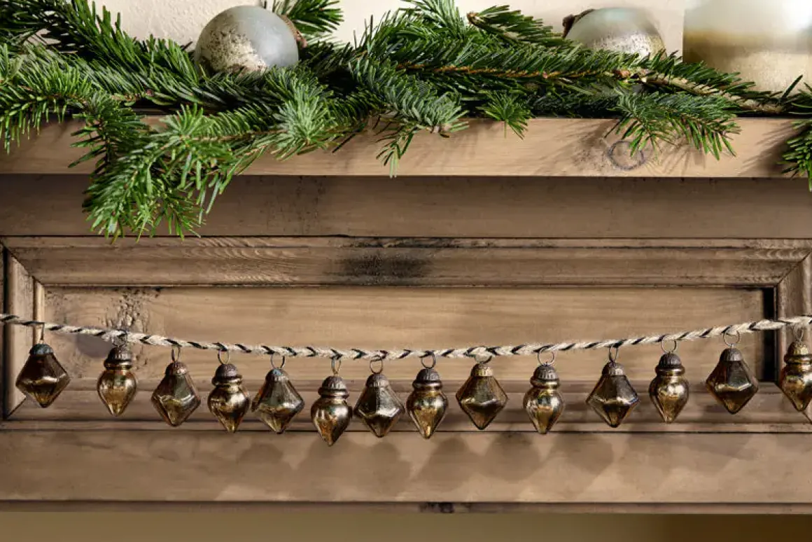 Antique gold is the perfect hue for decorating your home during the festive season. Our Ekiti bauble garland combines this refined colour tone with elegantly shaped recycled glass baubles strung along a natural jute garland. The garland has two practical hooks at each end looking stunning strung across a fireplace or placed on a tree.