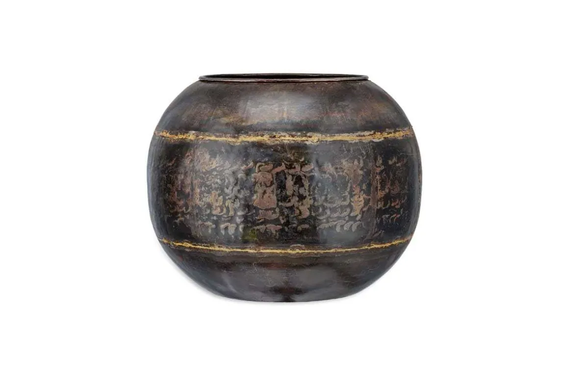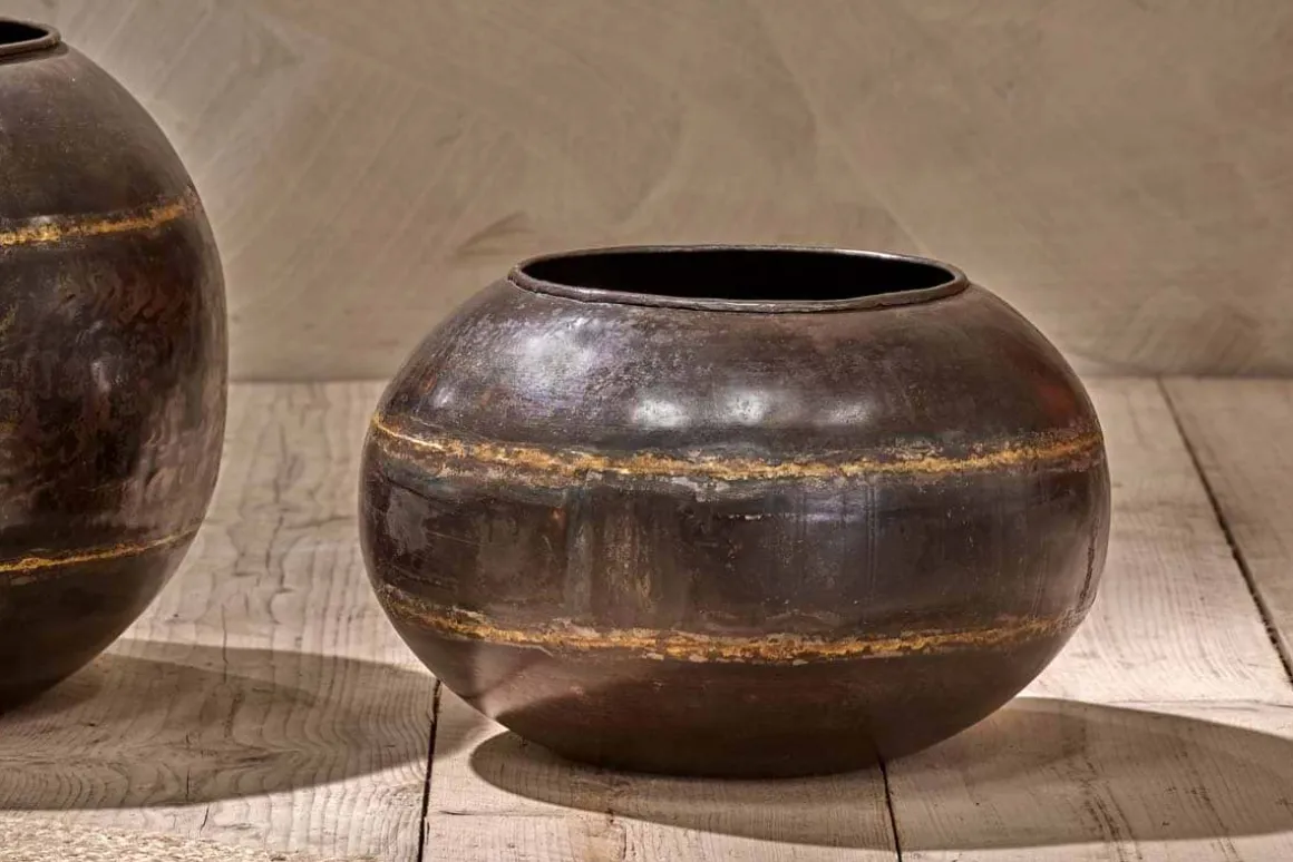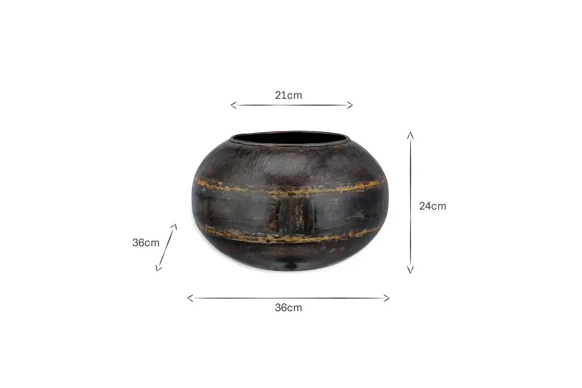 This striking and curvaceous small Endo iron vase is crafted from reclaimed materials that offer a unique aged patina. The distressed black iron is enriched with a golden brass thread creating a dramatic colour tone; the perfect backdrop for plants.