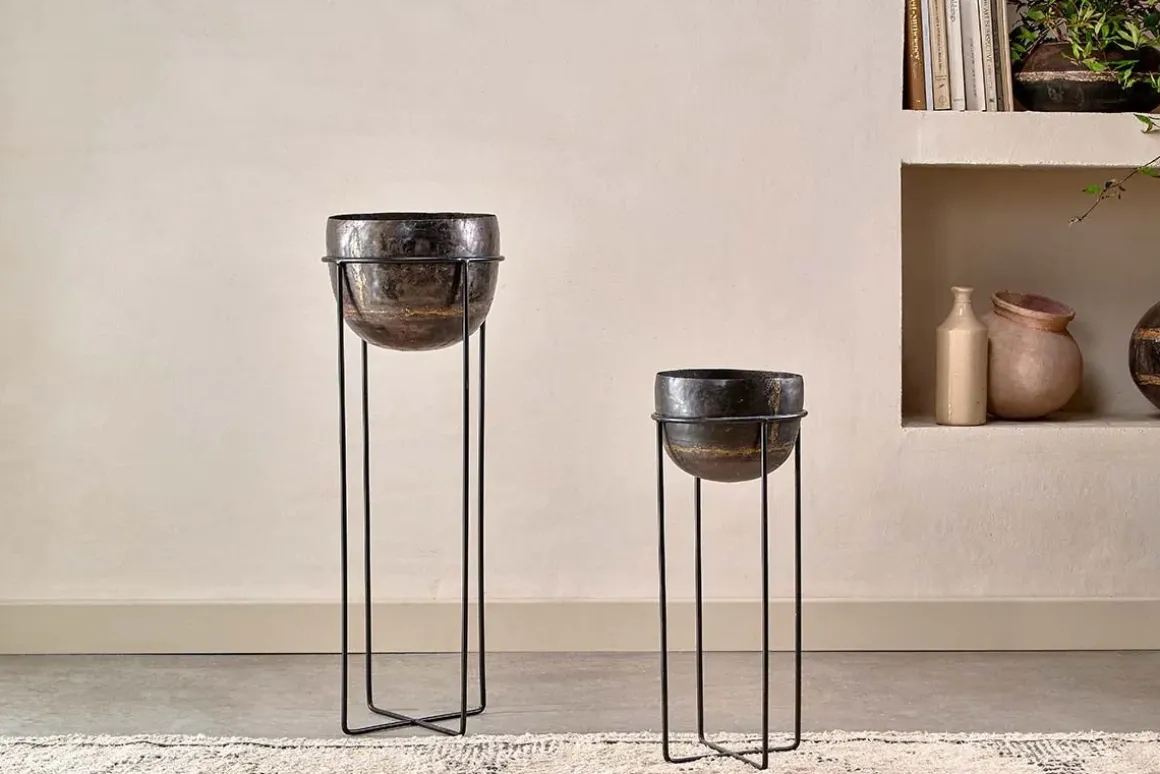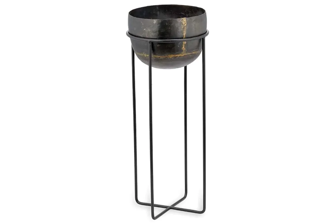 The elegant Endo reclaimed iron planter stand casts a striking silhouette. The lean angular black iron framework supports a distressed iron bowl that has a perfectly imperfect patina. Its dramatic tones are the ideal backdrop for leafy house plants and the elevation the stand offers will help you to create an interesting display around your home.