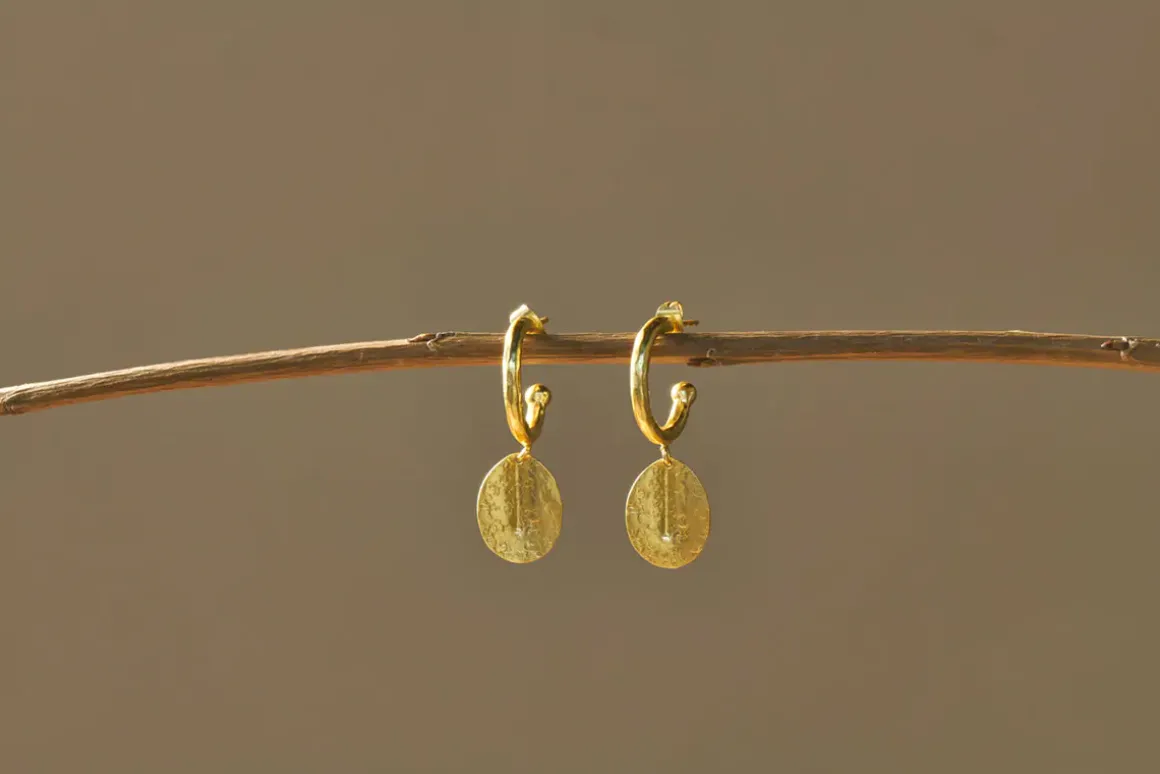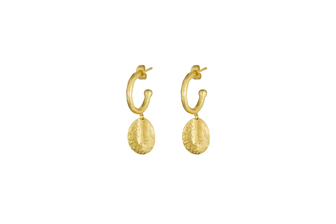With their warm golden hue and beautiful hoop-and-drop design, our Esta earrings make a sophisticated statement. A delicate disc is suspended from a classic hoop and is embellished with an intricate hammered design. Their timeless appearance is enhanced by the traditional techniques used to craft them. Every element of our jewellery collection is handcrafted, a low impact process which involves a skillset that has been honed over decades. The elegant aesthetic of these earrings makes them suitable for both day and evening wear.
