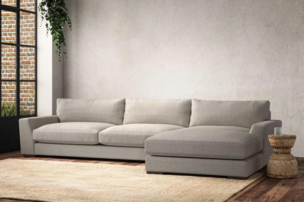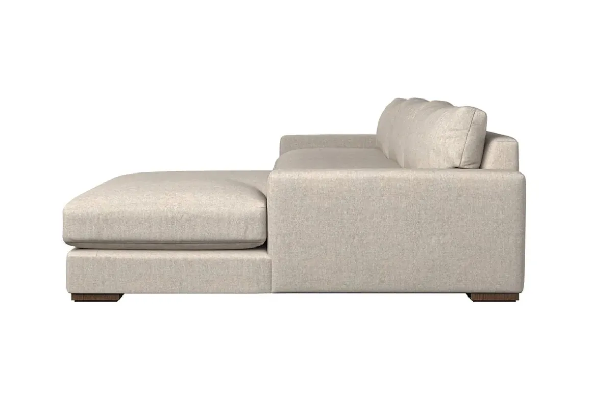 The laid-back sculptural shape of the Guddu grand right hand chaise sofa brings effortless style to an interior. The generous arms and deep seat cushions make this collection the perfect choice for families or those that like a bit of extra space to stretch out. Details include separate back cushions, exceptional quality fabrics and solid wood block feet. Each piece is handcrafted by experts using traditional techniques for a quality finish that celebrates the best of British craftmanship.