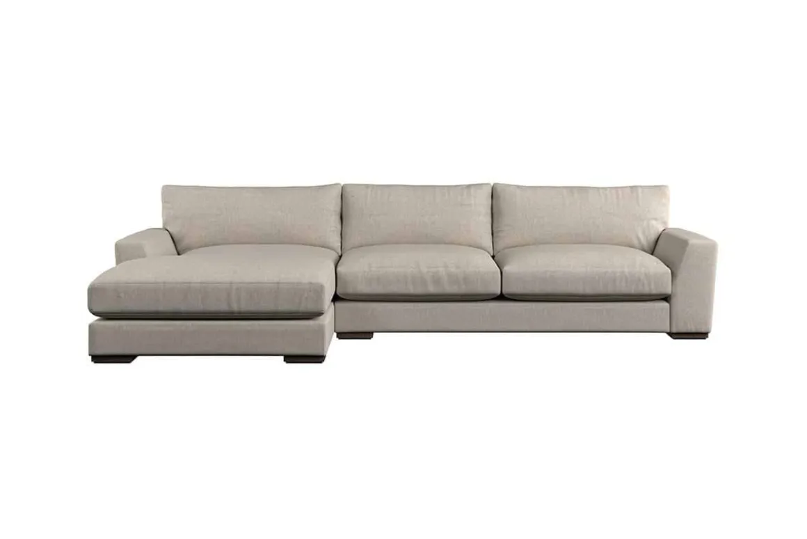The laid-back sculptural shape of the Guddu large left hand chaise sofa brings effortless style to an interior. The generous arms and deep seat cushions make this collection the perfect choice for families or those that like a bit of extra space to stretch out. Details include separate back cushions, exceptional quality fabrics and solid wood block feet. Each piece is handcrafted by experts using traditional techniques for a quality finish that celebrates the best of British craftmanship.