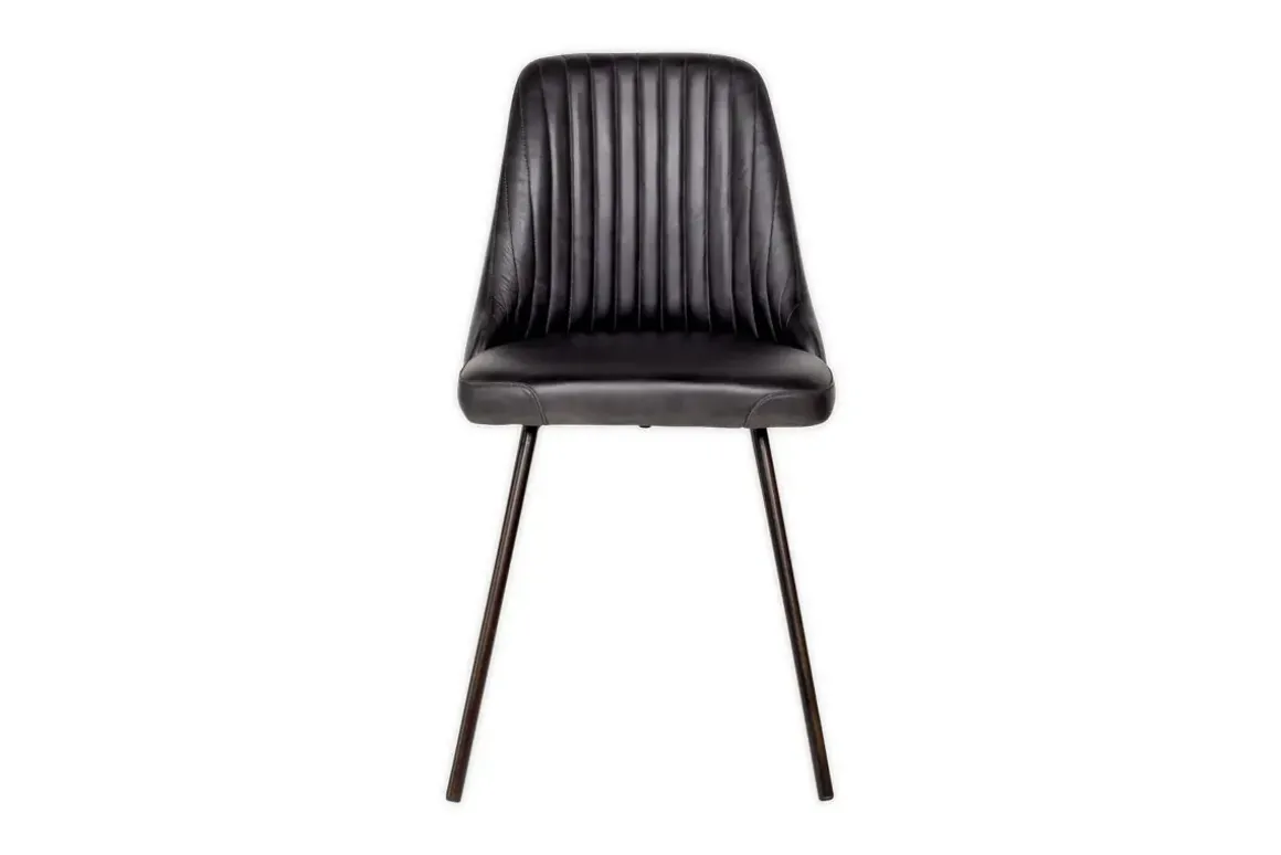 Sophisticated and stylish, the Harsha Dining Chair is beautifully upholstered in handmade buffalo leather, dyed a deep inky black, and stitched vertically along the back for a striking ribbed finish. Offering both comfort and support, the timeless design of this chair, with its elegant silhouette and simple iron frame works equally well at a dining table or at a desk.