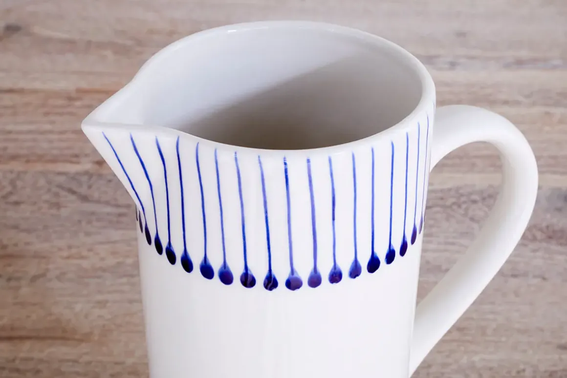 Our Iba Jug is handmade from white clay and delicately hand-painted in Vietnam with an intricate matchstick pattern. Light and fresh, it’s part of our Iba collection, offering a clean, modern design. Combining artisanal craftsmanship with practical functionality, it adds a touch of elegance to your every day.