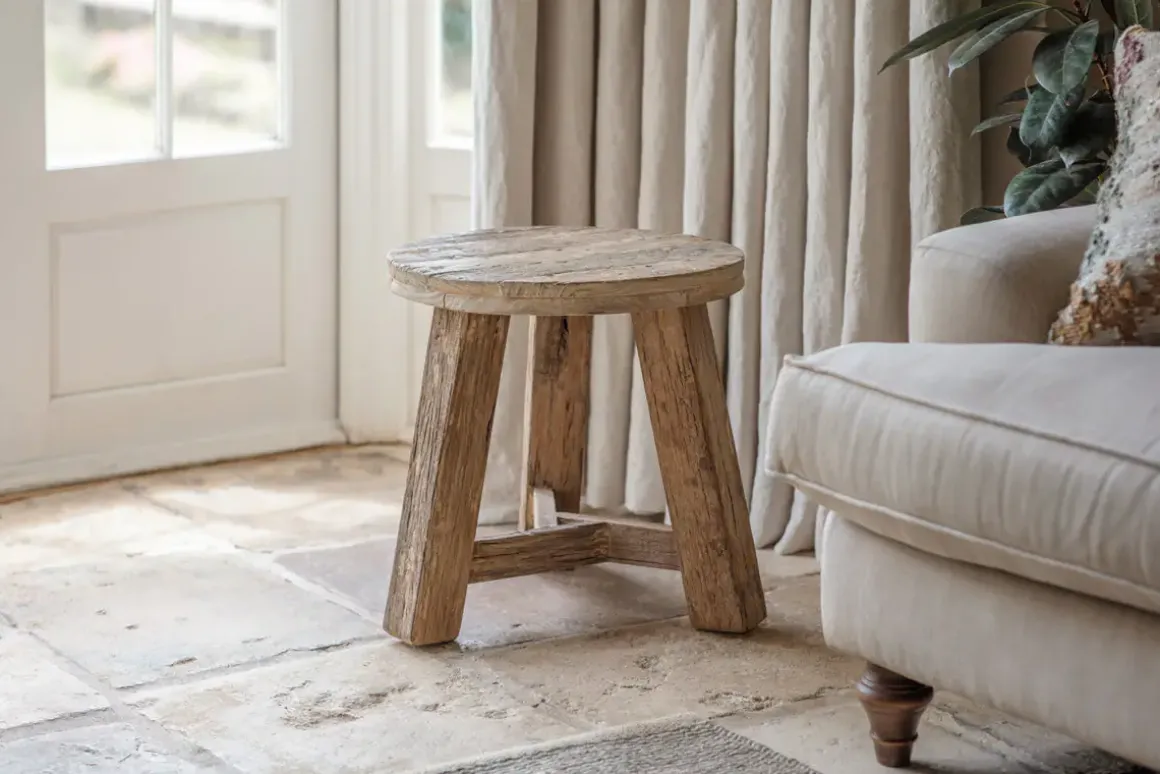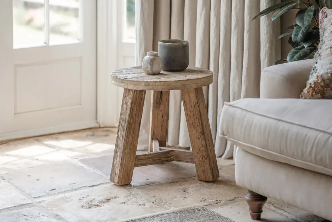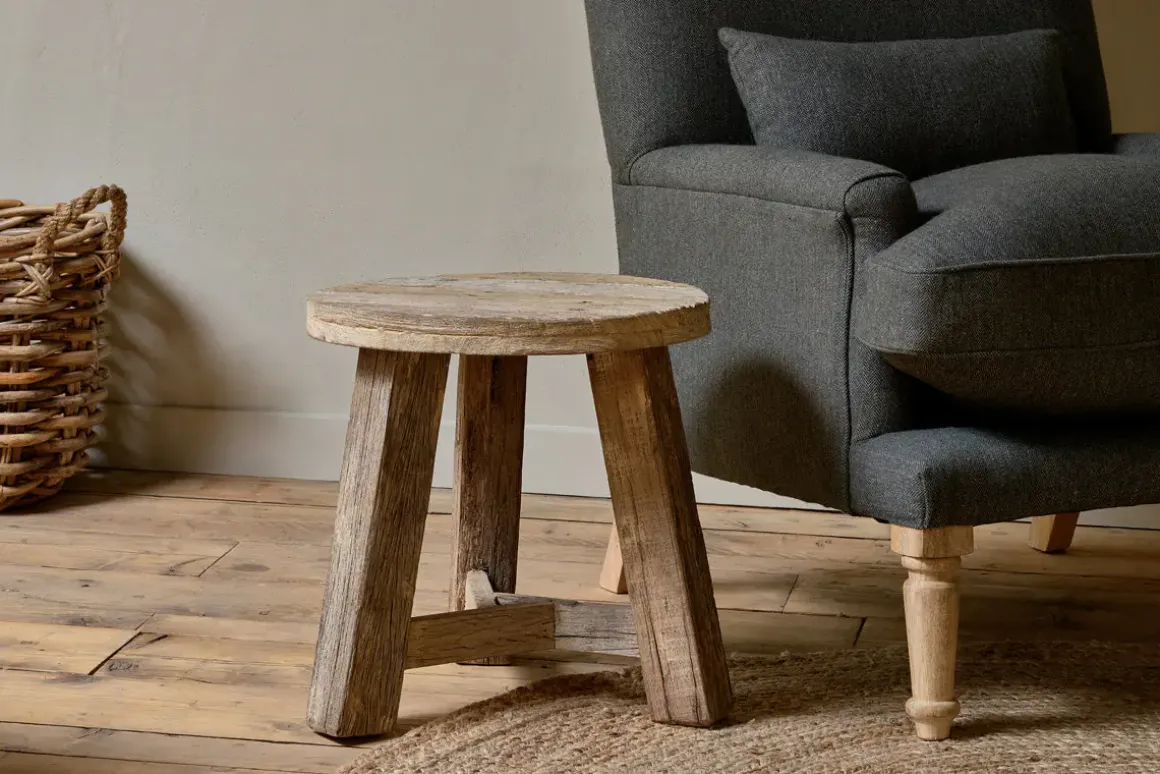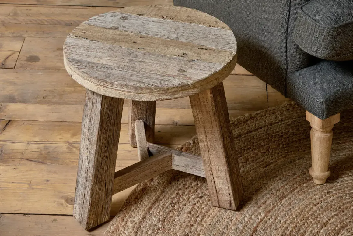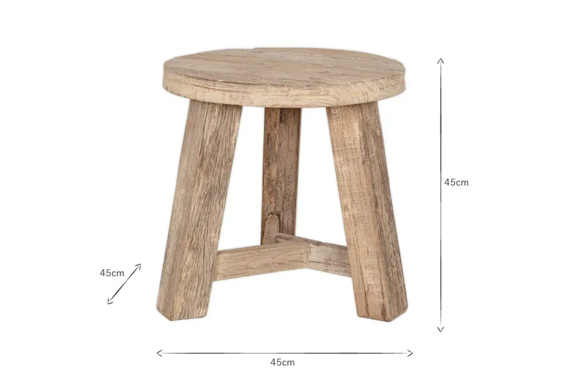 Our Ibo collection has an ingenious and creative origin story in the wooden panels from Indian trucks. The weathered tone and imperfections of the materials used in the Ibo Round Side Table come through beautifully, with every piece showing unique variations in the tone of the wood, authentic rough textures, and knots and splits in the grain which only add to the rustic charm. Strong and sturdy, the design is stylish yet simple and very versatile — perfect as a low stool or as a small side table. The pale, natural finish creates a laidback look that fits into a relaxed decor and brings tactility and interest to a room.