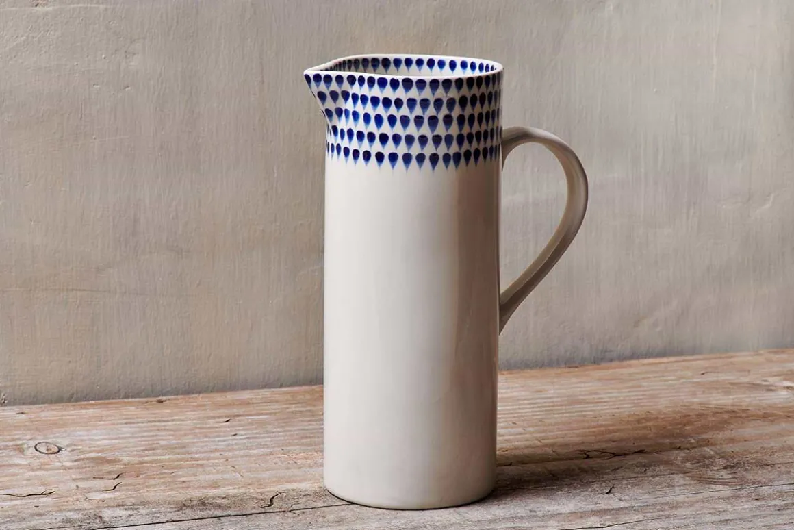 This elegant, tall Indigo drop jug has a well-designed handle and long elongated shape. The top features our signature indigo drop pattern, skilfully hand painted.