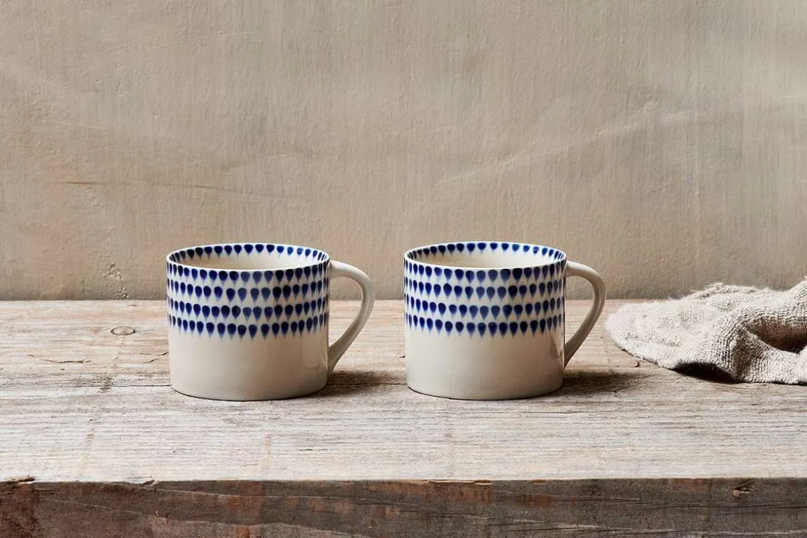 These perfectly proportioned coffee mugs are hand painted with a stunning indigo drop design. The pattern features around the lip of the mug and contrast perfectly against the off-white glaze.