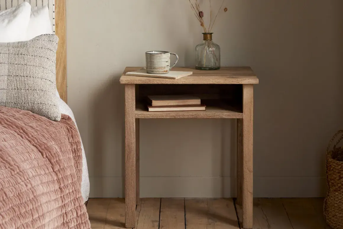 This bedside table offers a timeless, understated design with a solid, chunky structure that brings warmth and texture to any bedroom. Its simple form fits seamlessly into both rustic and contemporary spaces, with a spacious surface ideal for stacking books, notepads, or bedtime essentials. A practical and characterful piece that works beautifully beside any bed.