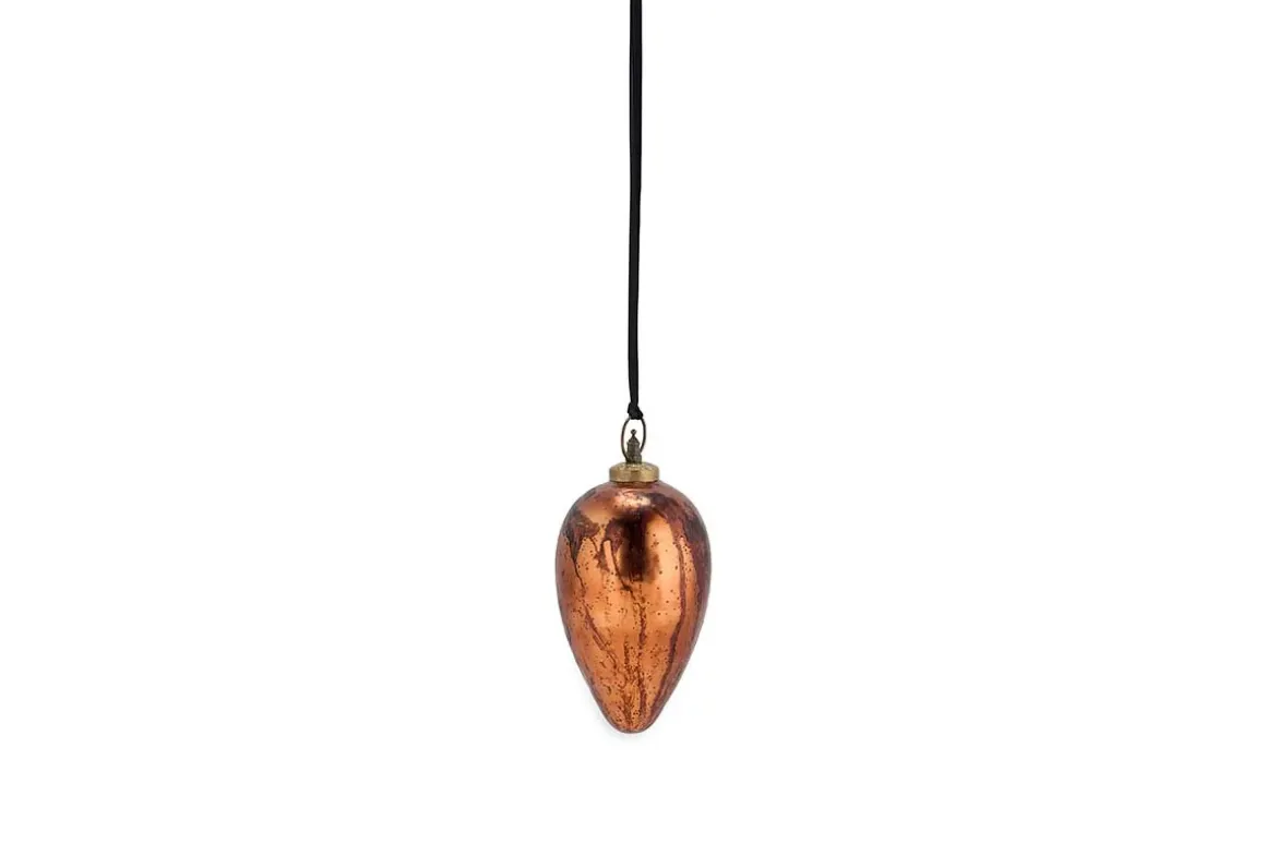 The giant proportions of the Jalshara giant bauble make this a striking festive addition with the dew drop shape adding to the timeless elegance of this stunning decoration. The Jaishara has a warm opulent antique copper finish that adds to its unique appeal where each one is strung with a black velvet tie. These decorations are perfect for creating a statement feature in an entrance way or above a table.