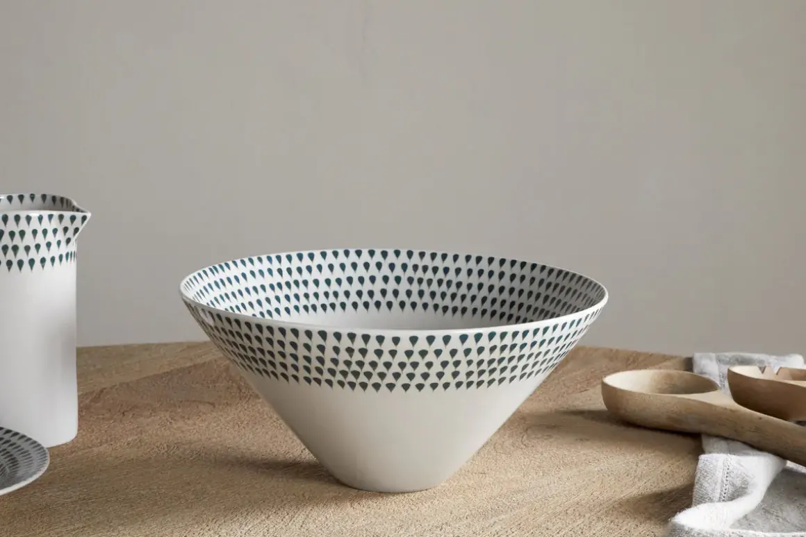 With its generous size and eye-catching drop design in deep juniper green, this serving bowl makes a beautiful centrepiece for shared dishes. The wide, angular shape is ideal for everything from vibrant salads to warming mains, while the bold pattern brings a sense of depth and texture to the table. A versatile and decorative addition to everyday dining or special gatherings.