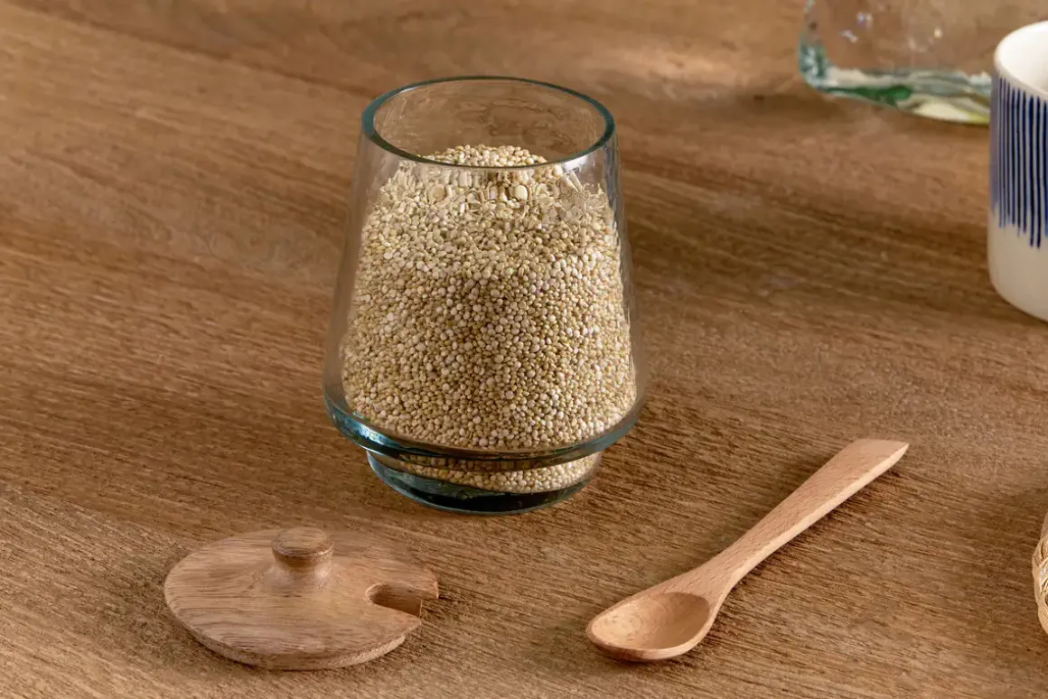 Elevating your kitchen counter and pantry cupboard storage to new levels, this beautifully crafted glass jar with mango wood lid and spoon will add a touch of elegance to your kitchen line-up. Perfect for storing dry goods or condiments and breakfast preserves, the soft patina of the glass brings a tactile quality to the piece as does the natural grain of the mango wood.
