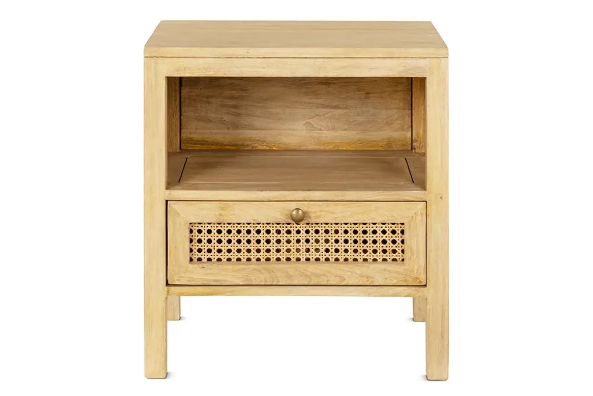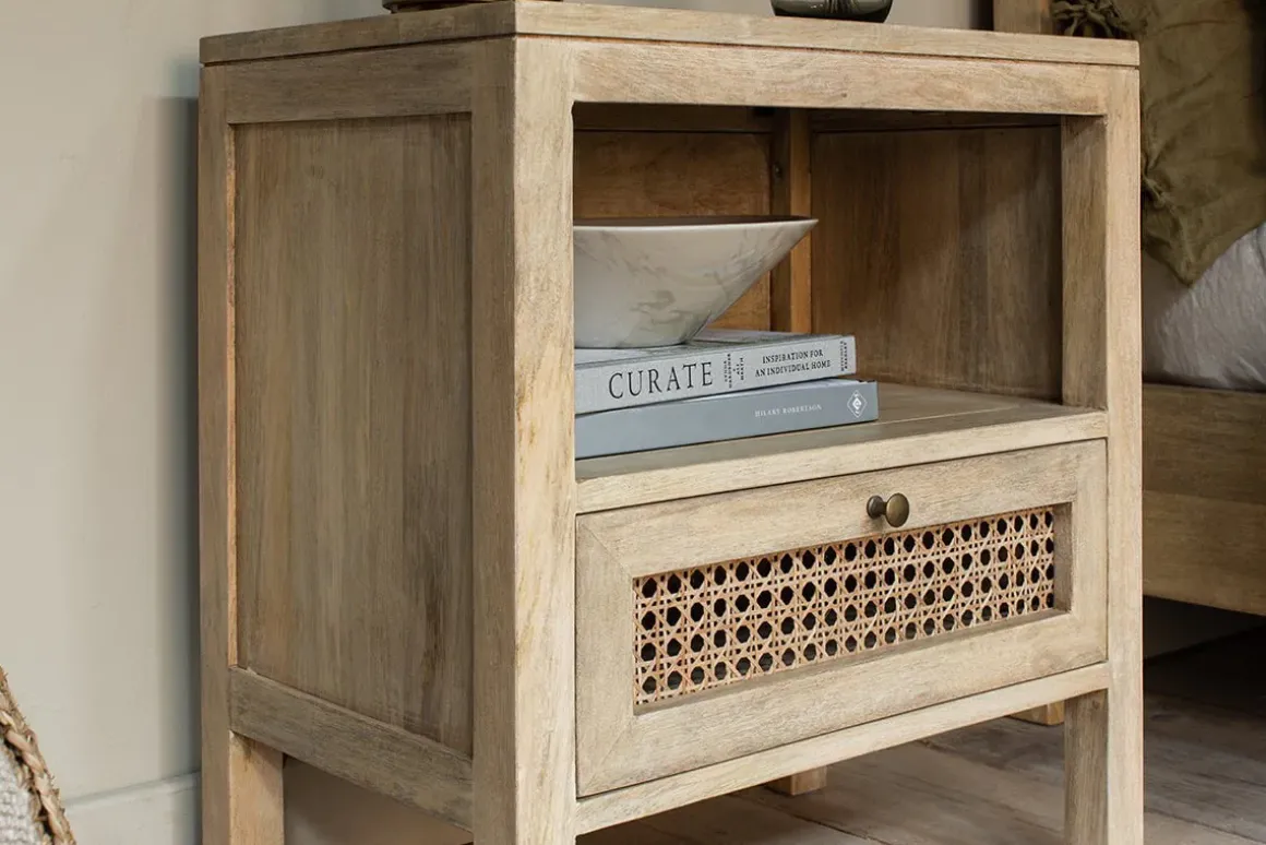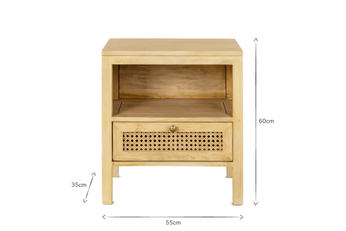 The soft natural tones of our Kanz bedside table create a warm, sophisticated aesthetic. It’s crafted from mango wood, a sustainable alternative to other wood types as it’s only harvested once the tree stops bearing fruit. The wood grain is clearly displayed, adding an appealing organic look and feel. Intricately handwoven cane completes the look, enhancing the mango wood with a beautifully detailed finish. A practical drawer is included which is ideal for storing books, a pair of glasses and other bedtime essentials.