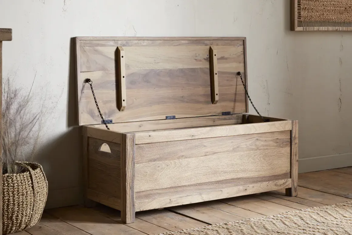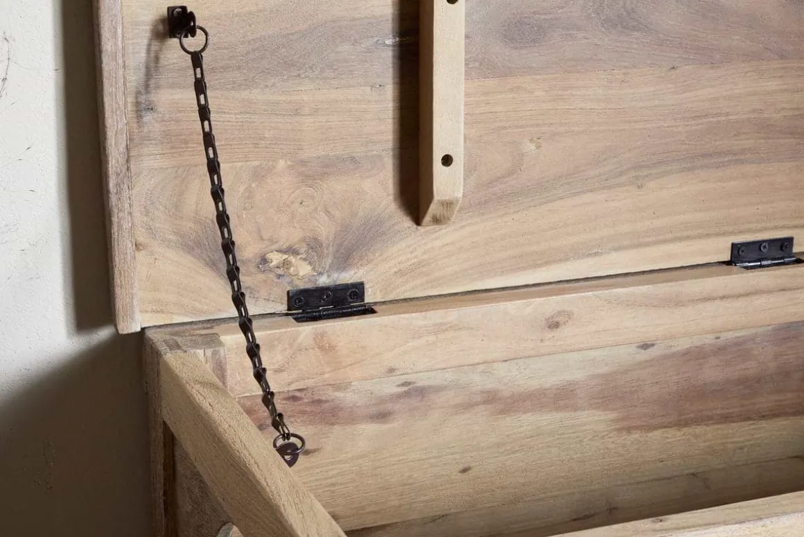 Full of character and history, this storage bench is crafted from reclaimed wood once used as ceiling beams in traditional Indian homes. The rustic surface showcases the natural grain, marks, and imperfections that speak to its past. With a chunky, sturdy structure and cut-out handles on either side, it offers generous internal storage while doubling as a bench. Ideal for a hallway or bedroom, it brings both function and timeless charm to your space.