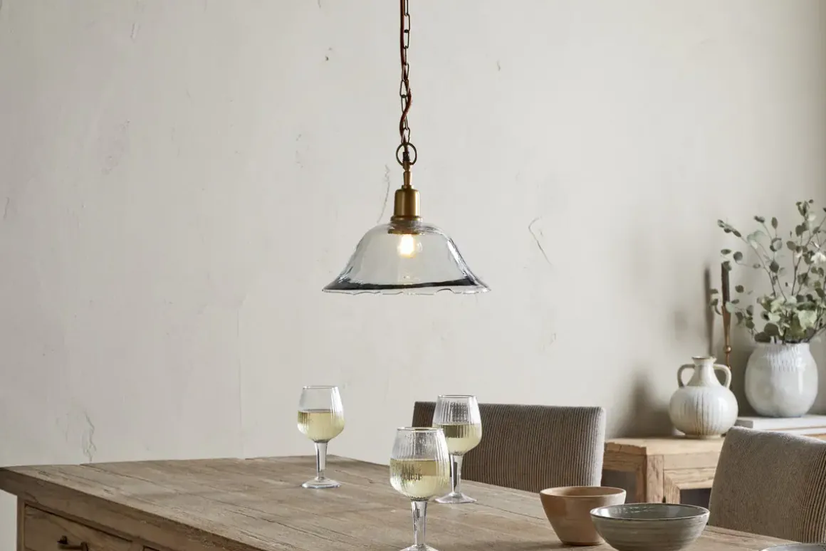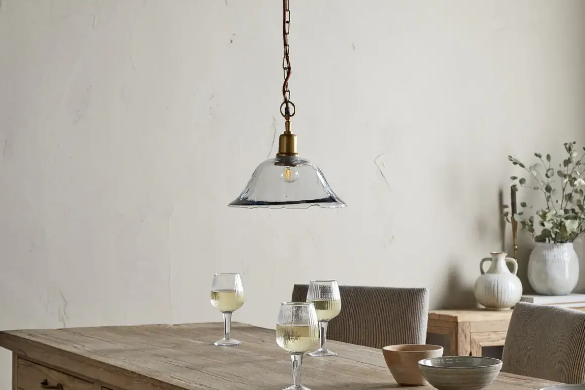 This pendant light features an organically shaped glass shade, finished with a soft lustre that catches the light beautifully. The warm tones of the glass are complemented by a rich antique brass ceiling plate, creating a refined, balanced look. Striking over a dining table or in an entranceway, it makes an elegant first impression. Available in clear or amber glass.