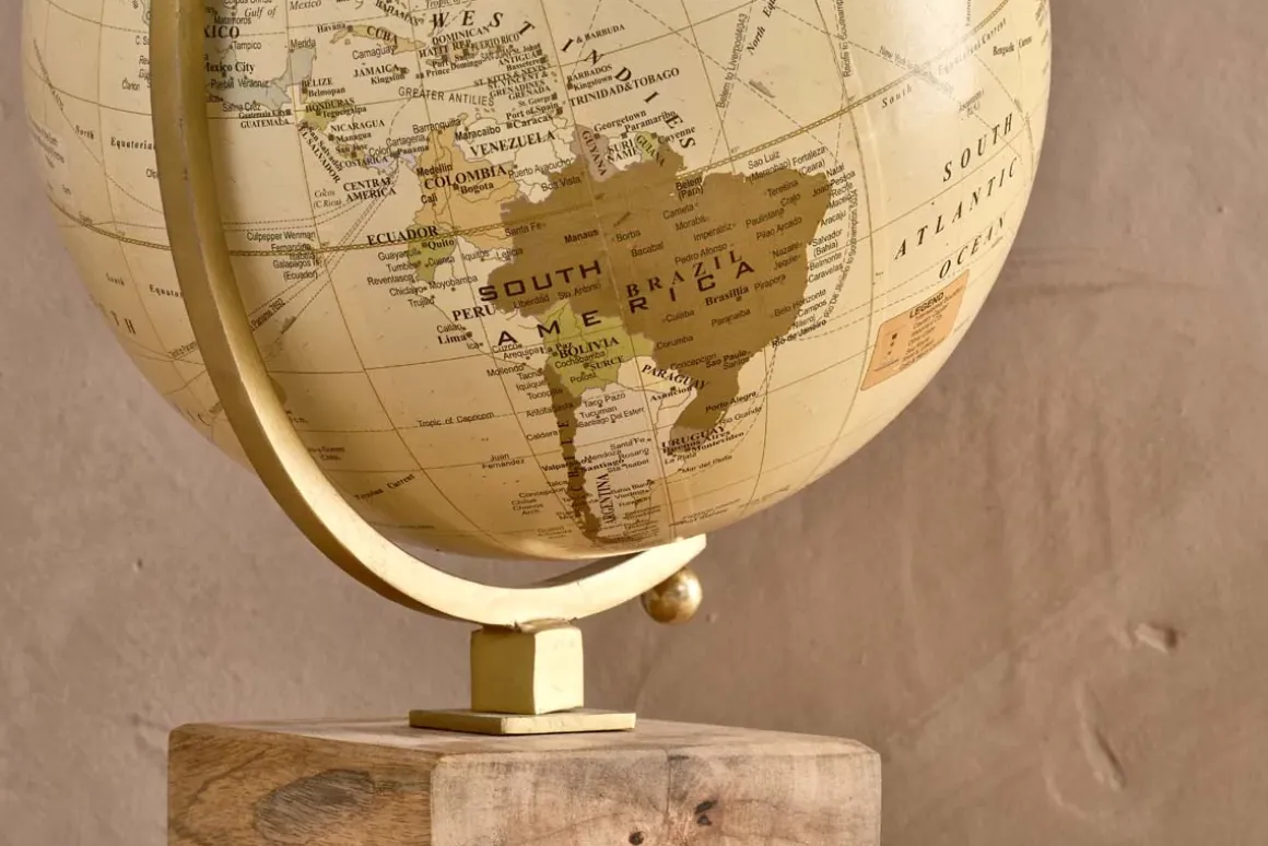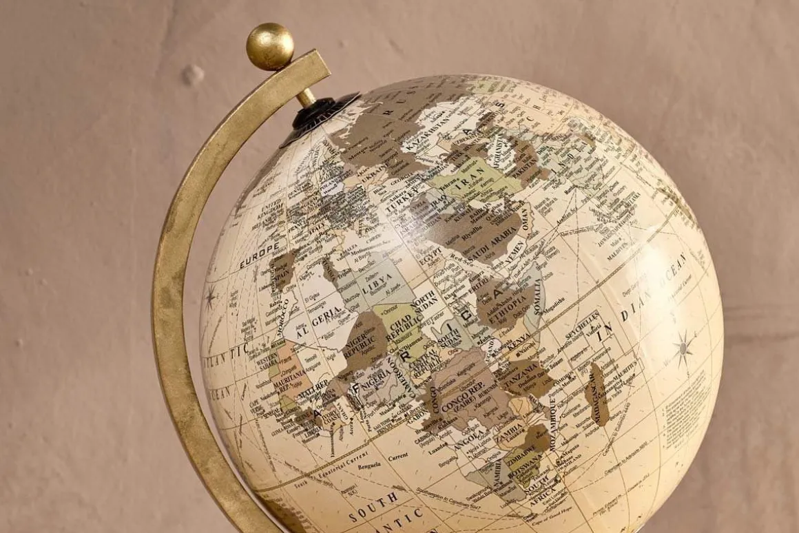 A globe conjurs up visions of explorers and adventurers; it is also a great accessory for a living room or study. The Kenda decorative globe captures the nostalgia of bygone adventurers and helps you plan your own new ones. The soft sand-coloured tones of the globe are complimented with the brass-hued axis, and the warm natural tones of its chunky mango wood base.