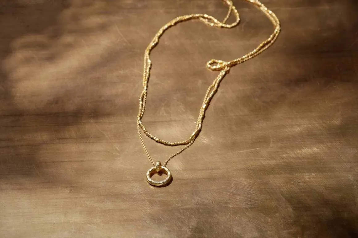 The multi-layered chain of the elegant Khanti necklace supports a striking circular pendant. The pendant centre point is a beautifully crafted circular band that has a rich hammered texture, created using traditional methods. The multi-layered chain includes a long refined chain where the pendant sits, and a shorter rustic beaded chain that rests slightly higher up; each individual bead of this layer is handcrafted.The overal compostiion makes the Khanti a standout necklace that is a pleasure to wear. Hypoallergenic and nickel-free, with gold plating.
