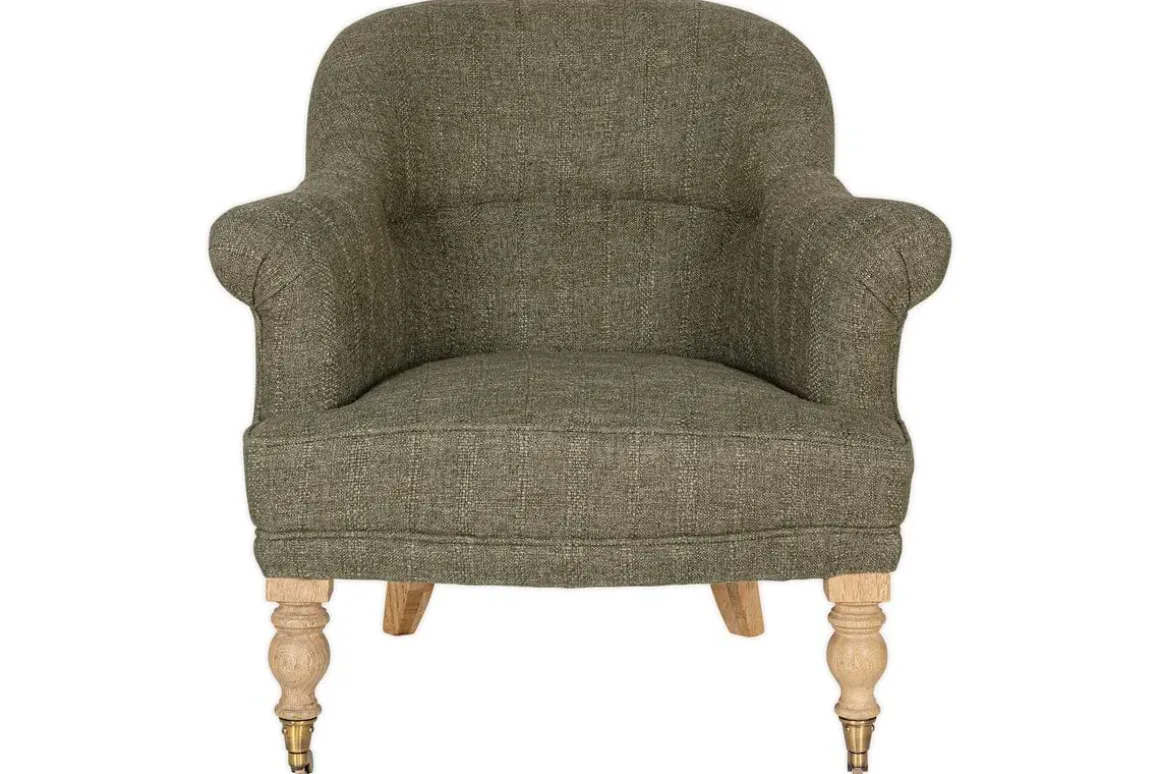 Upholstered in cotton with a subtle woven stripe, this tub-shaped armchair offers a soft yet structured presence. The hand-carved mango wood legs add warmth and a touch of detail. The front two legs are set on castors for effortless movement. A timeless accent for any reading nook or living space, this piece is invitingly comfortable and beautifully crafted.