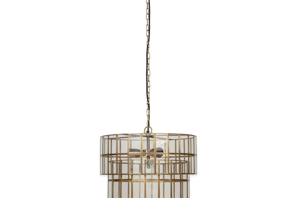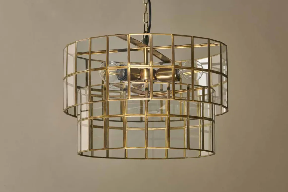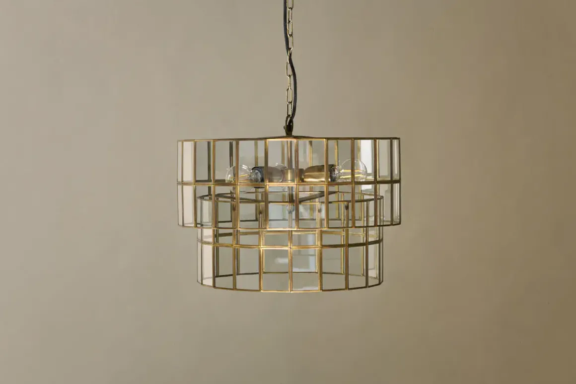 We’ve added this stunning two-tier chandelier to our Kirindi lighting range. The unique design features have been carefully chosen to enhance the overall piece. The glass panels have been set within an iron frame that has been given an antique brass finish, with a matching brass bulb holder and hanging chain. This creates a simple yet elegantly versatile design, while the size of the panes and the over-layering effect creates real impact. This Kirindi glass panelled chandelier would look sensational as a pair in a living room, or above a dining table or in a hallway for a striking statement. A Kirindi pendantis also available.