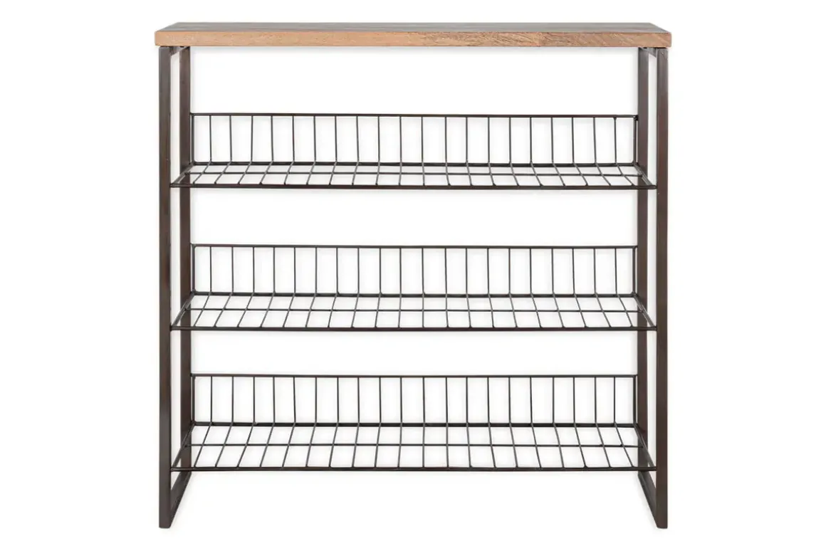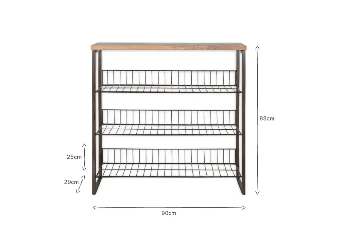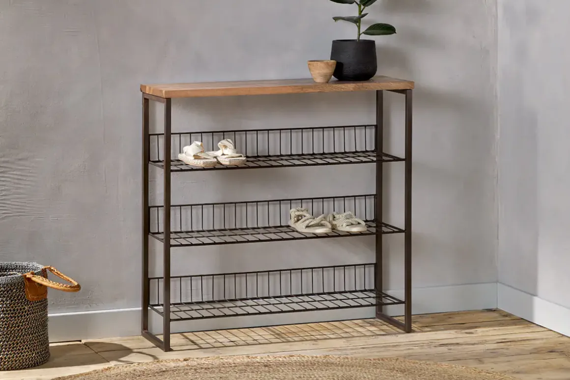 The industrial aesthetic of the tall-standing Kiyoma storage bench is balanced by the natural warmth of the mango wood top. Perfect for a hallway, utility or boot room, the clean lines and simplicity of design lend this piece a versatile look that works in almost any space. These low standing shelves are crafted from mango wood, whereby the trees are only cut down once they have stopped bearing fruit, and soldered iron, making for a sturdy and durable storage solution for shoes, boxes and general household items.
