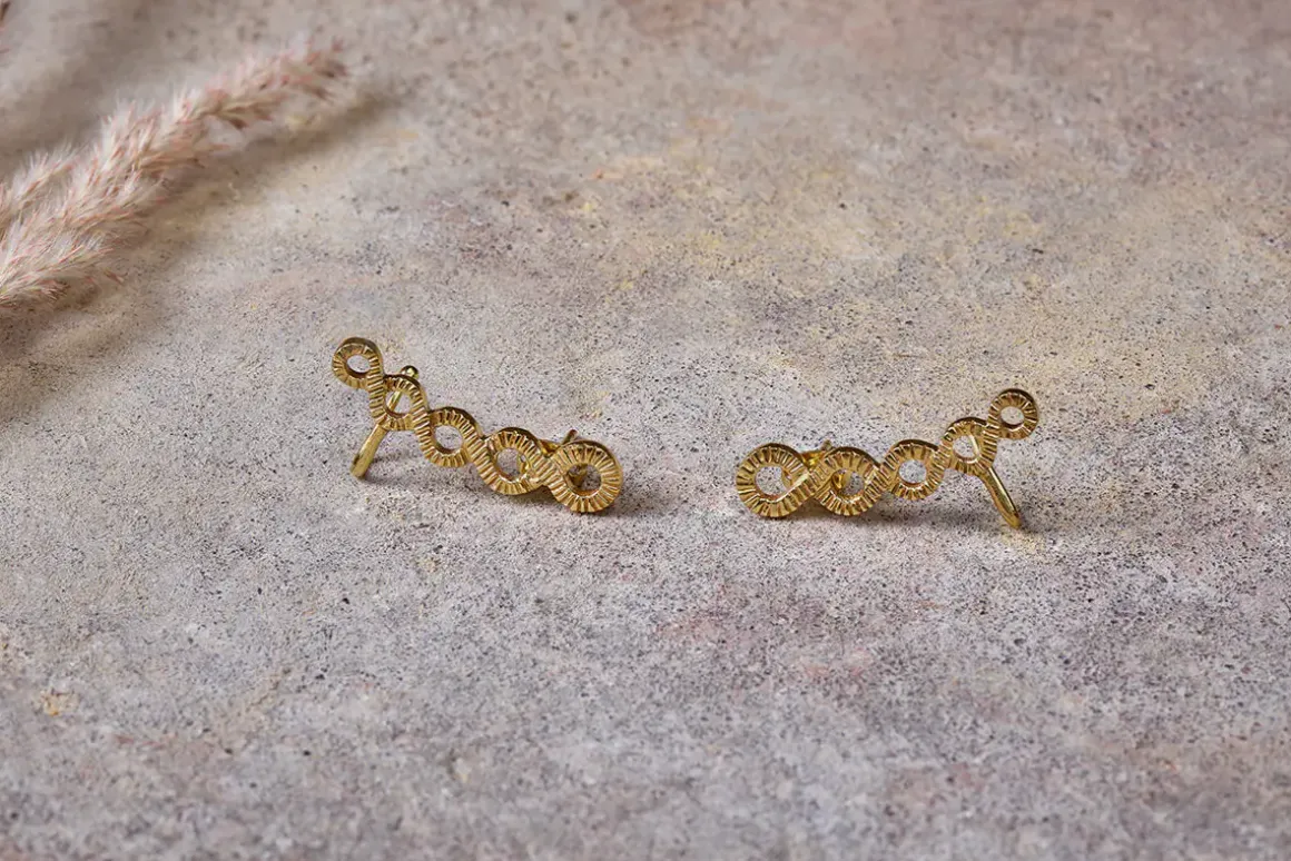 Our Lalia Ear Climber is a delicately elegant piece made from five gold plated loops that have been soldered together, each loop increasing in size as they follow the curve of the design. Its simplicity pares beautifully with the hand-etched finish that catches the light and adds a considered touch that creates standout without vying for attention.