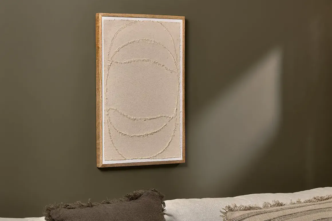 Our Larisa wall art brings elegant simplicity to walls and natural style to your living space. The minimalist and subtle design, inspired by organic shapes found in nature, is hand threaded onto a raw cotton canvas for a delicate and beautifully original piece of art. Each one is unique as it is individually sewn offering slight variations between canvases. The solid sustainable mango wood frame creates a neutral backdrop for a simple finish.