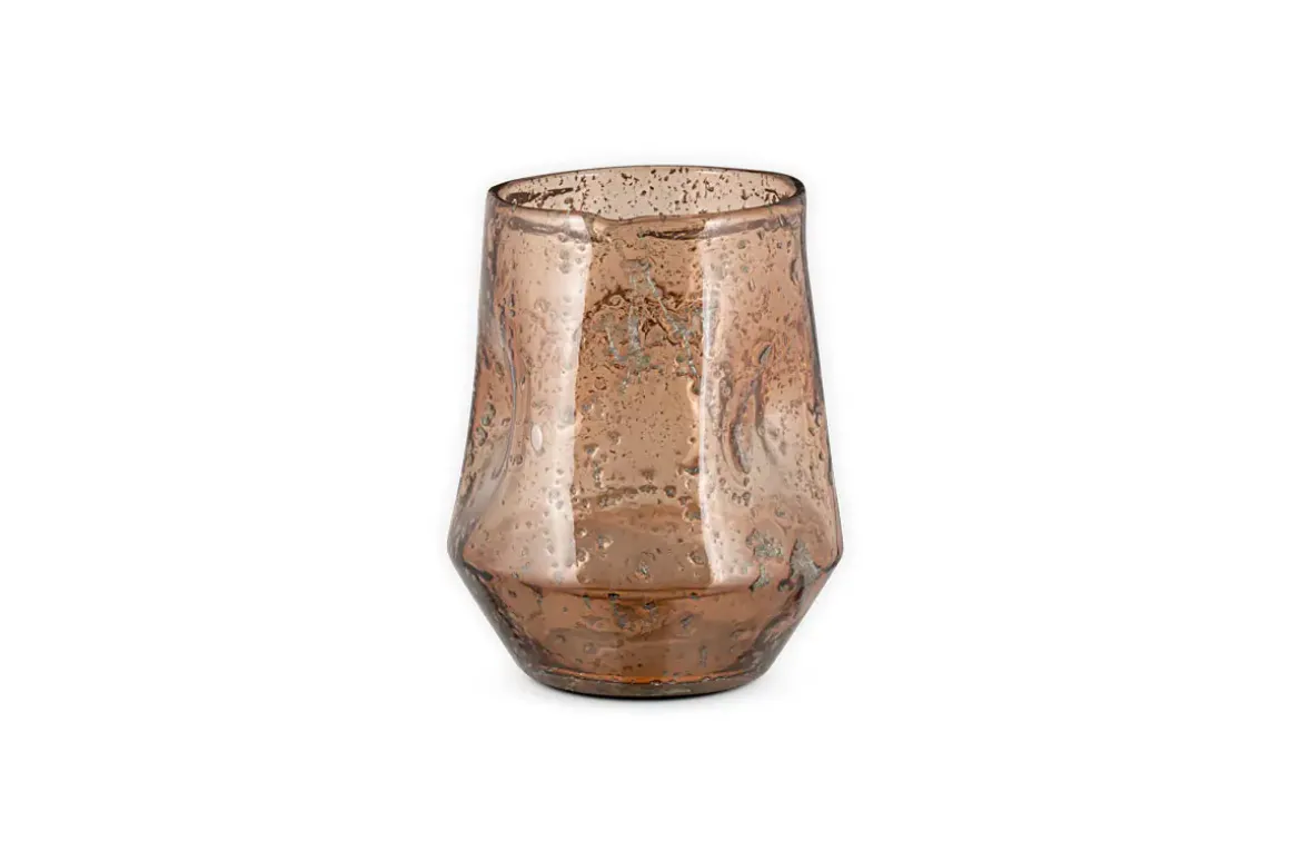 These unique pieces are crafted with care from hand-blown recycled rust-coloured glass mixed with slivers of aluminium to create a unique pattern for a subtle warmth that gives an atmospheric glow when a candle is lit inside. The organic shape, with its pinched detailing, is created by an artisan using tongs when the glass is removed from the mould, meaning no two pieces are alike. Available in two sizes.
