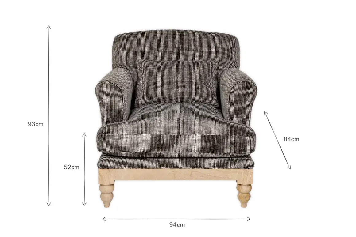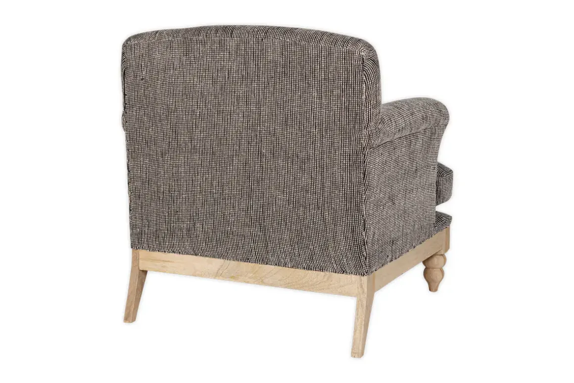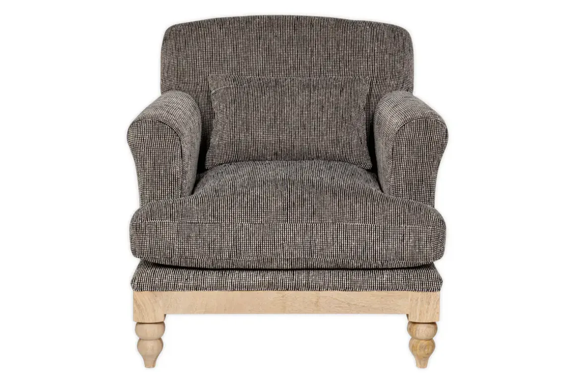 Our sumptuous Maganda armchair offers a generously proportioned seating option, adding a dramatic focal point to any living space. Upholstered in a beautiful cotton yarn with a charcoal colourway and an off-white weave, the Maganda creates the perfect excuse to get comfortable and take a moment to truly unwind. Ideal for placing in a cosy nook or reading corner, this classically-shaped yet contemporary-looking chair has a solid mango wood base with carved feet that bring an extra touch of considered detail to this unique design.