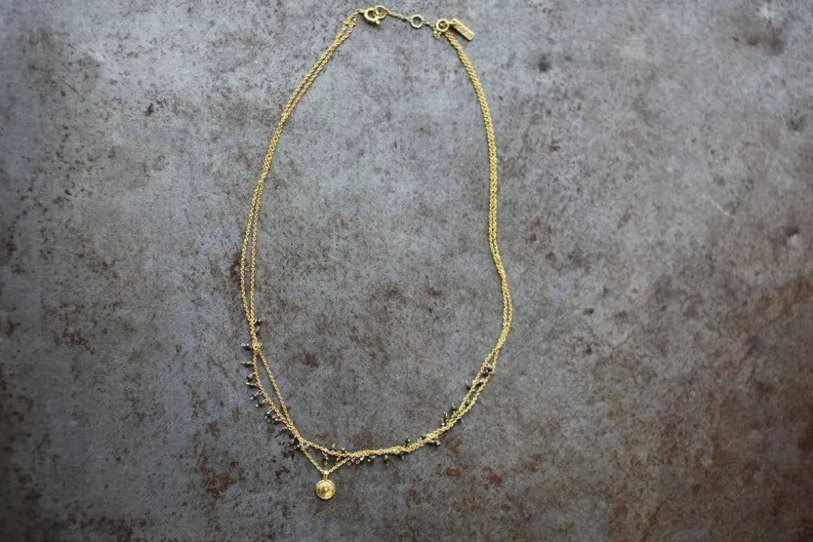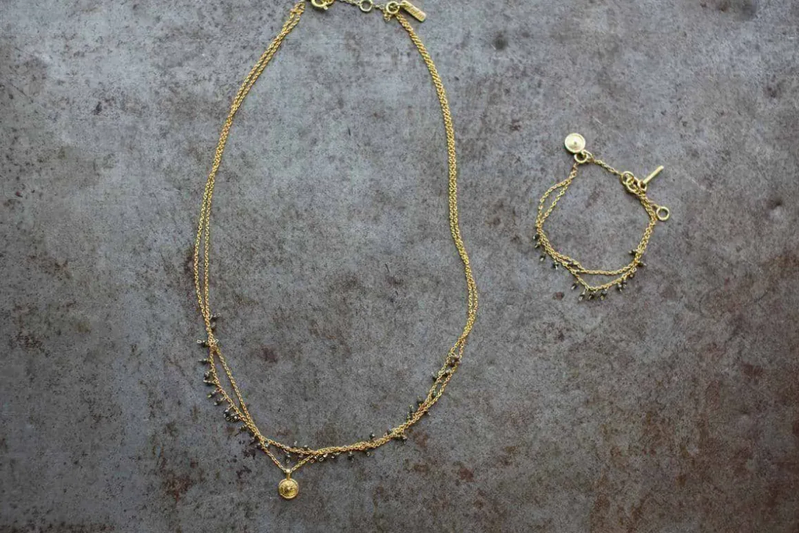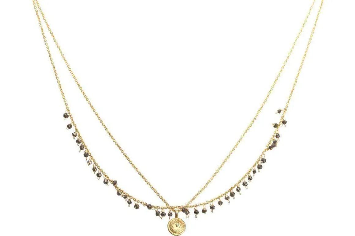 We love the delicate grace of this Mai necklace. The pretty design is asymmetric and made from Pyrite stones.