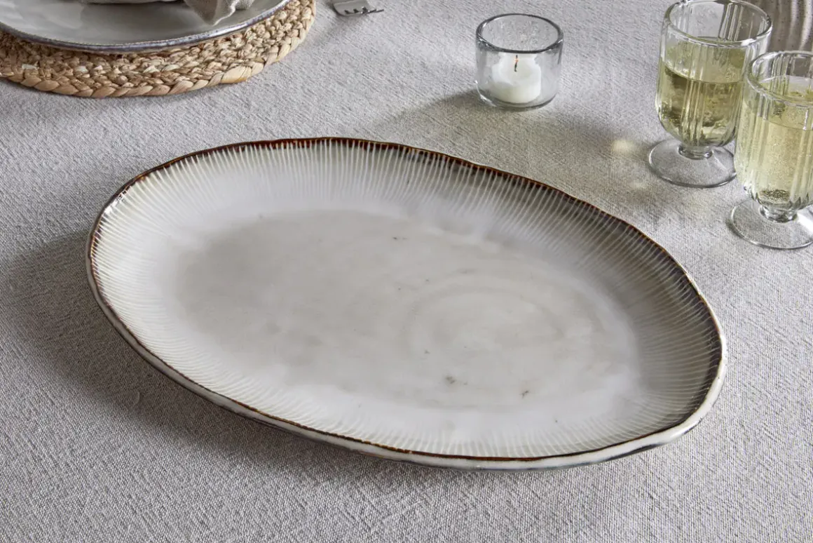 The Malia serving platter brings understated elegance to the table with its smooth, organic shape and reactive cream glaze. Each piece features subtle variations in tone, making it beautifully unique, while a fine hand-painted line around the rim adds a delicate finishing touch. Generously sized for sharing feasts, appetisers, or desserts, it-s a beautiful piece for special occasions.