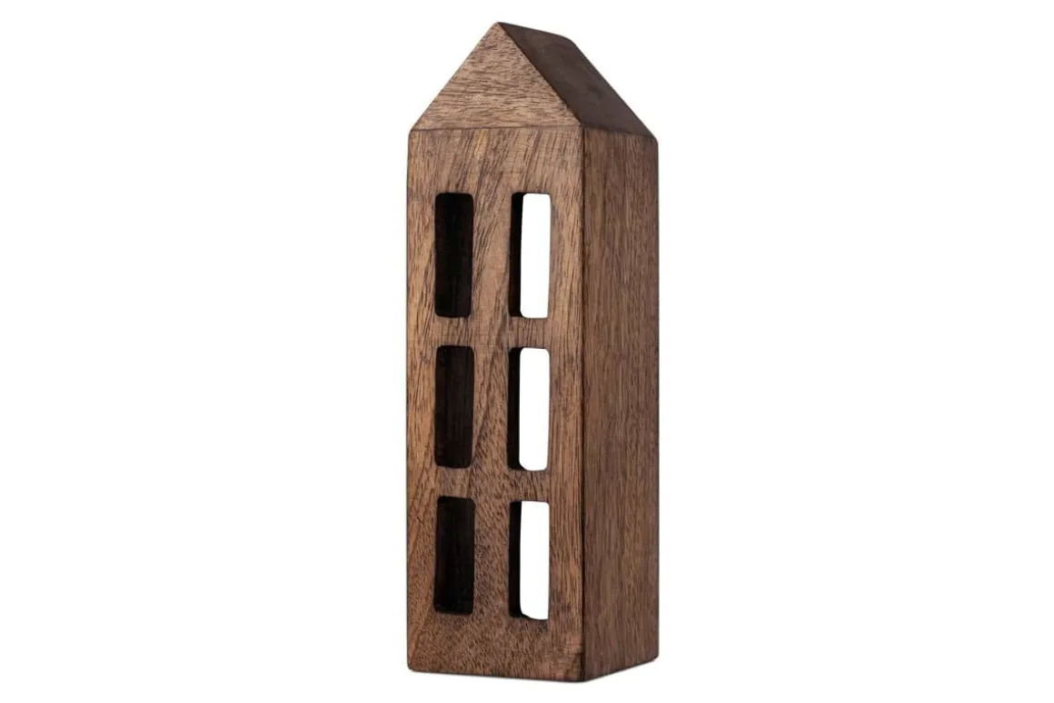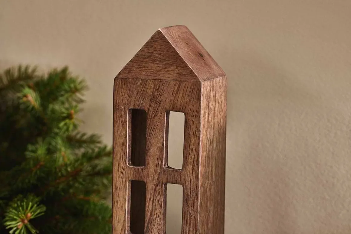 The beautiful rustic finish and rich dark brown hue of this Mandar wood house make it a timeless addition to your home. Try combining with different sized wood houses and fill with LED candles for a welcoming, Christmas village feel. Its carved from mango wood, which is a durable and sustainable option. The trees are only cut down once theyve stopped bearing fruit and using mango wood reduces the risk of endangered tree species being cut down. Please dont use this product with candles.