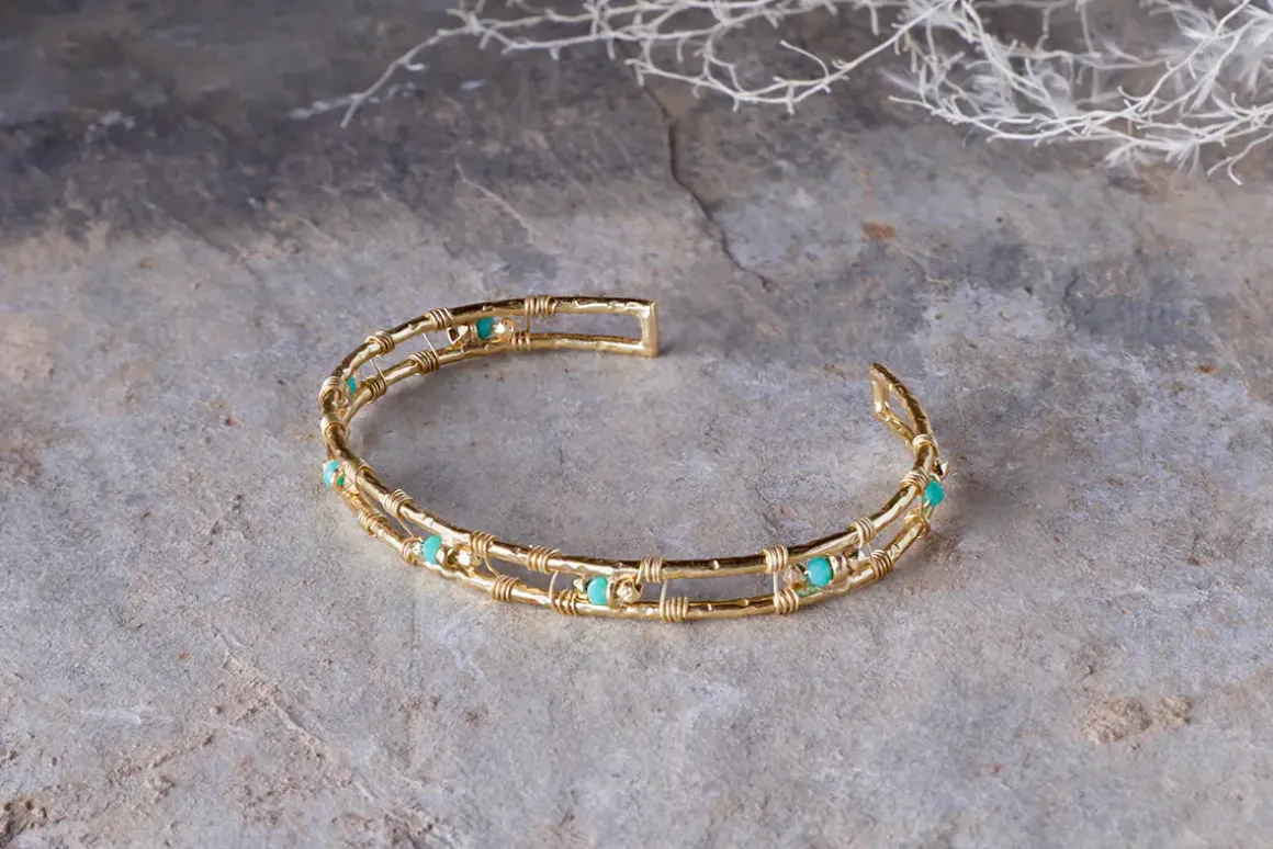 Delicate and stylish, this beautiful cuff-style bracelet boasts the perfect summer pairing – turquoise chalcedony, that brings to mind crystal clear seas, nestling among a warm gold plated setting. Chunky and eye-catching with intricate wirework and a simple double frame that holds seven semi-precious stones, this is a striking piece that would look beautiful alone or paired with other pieces from our collection.