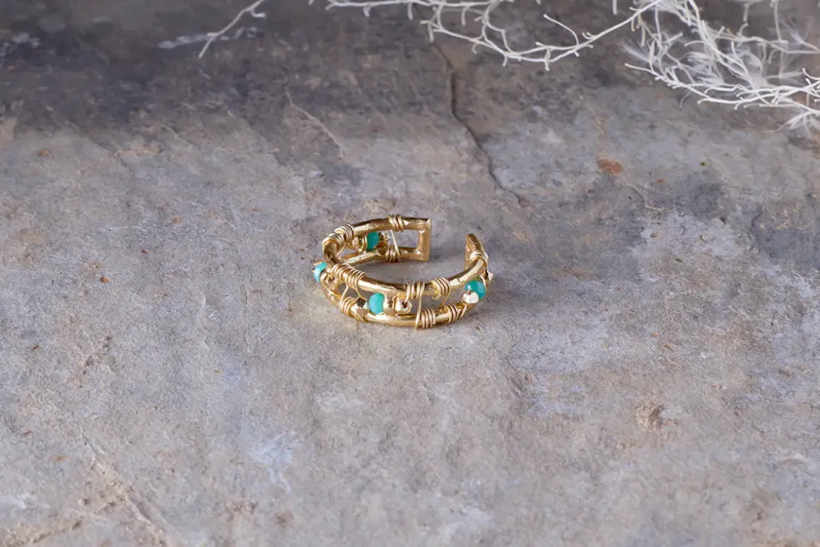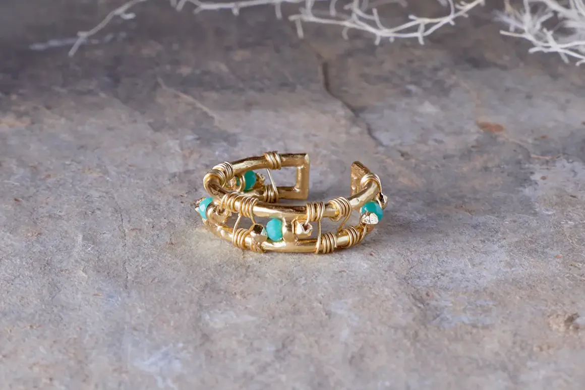 Exuding a gentle glow, this gorgeous ring boasts the perfect summer pairing – turquoise chalcedony, that brings to mind crystal clear seas, nestling among a warm gold plated setting. Chunky and eye-catching with intricate wirework and four semi-precious stones, this is a striking piece that would look beautiful alone or paired with other pieces from our collection.