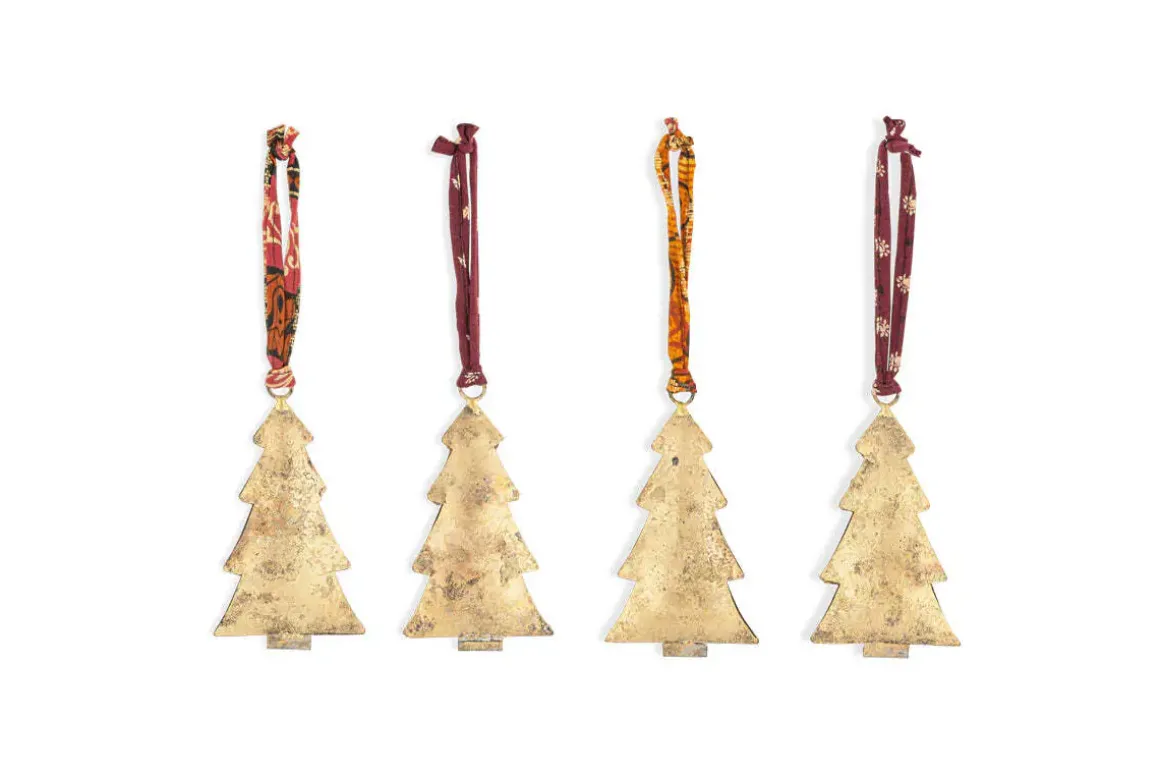 These iron baubles feature a striking tree silhouette with an antique brass finish, bringing warmth and character to any festive display. Their slim profile make them ideal for hanging on branches or incorporating into decorative arrangements. Finished with vibrant sari ties, they add a touch of colour and texture to seasonal styling.