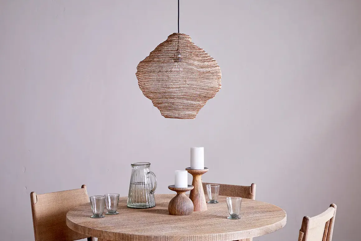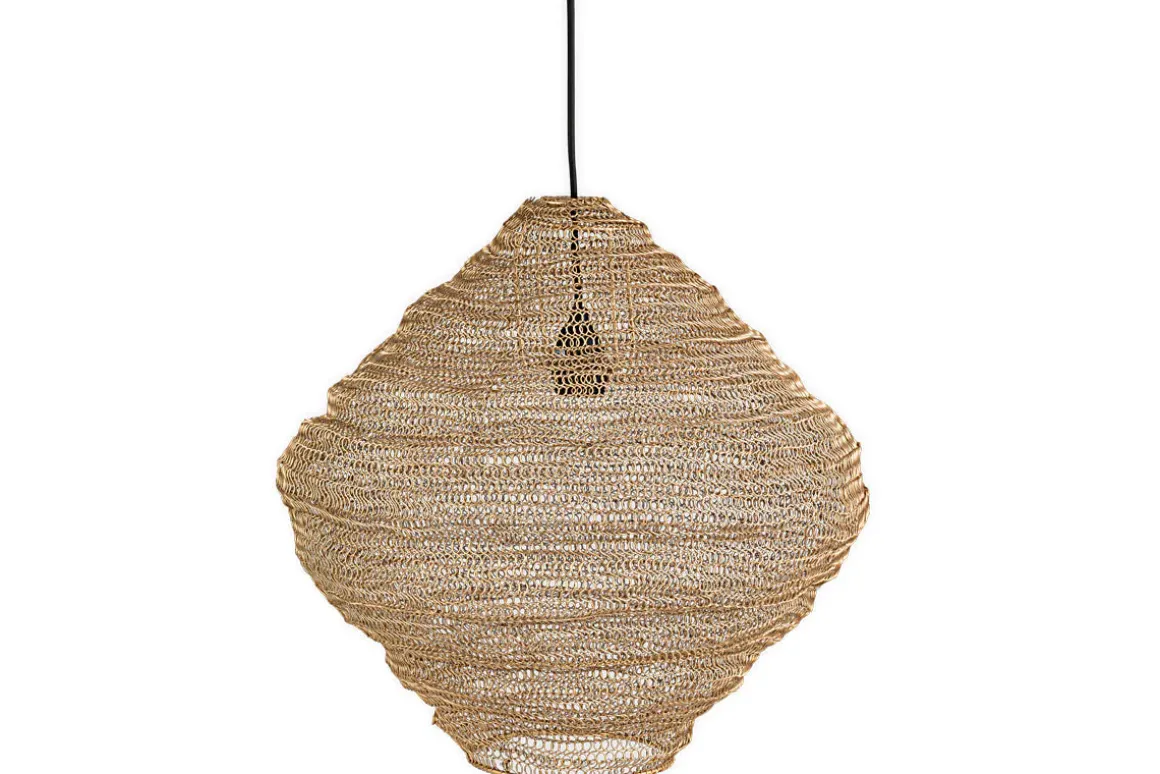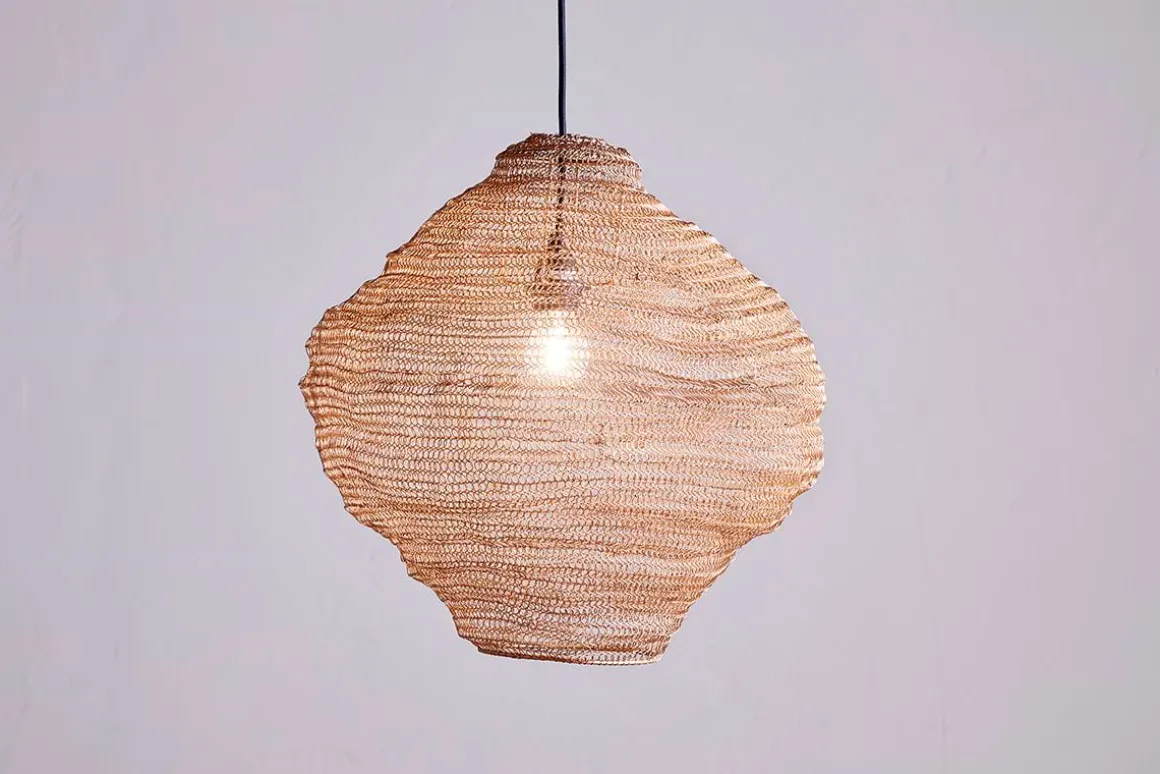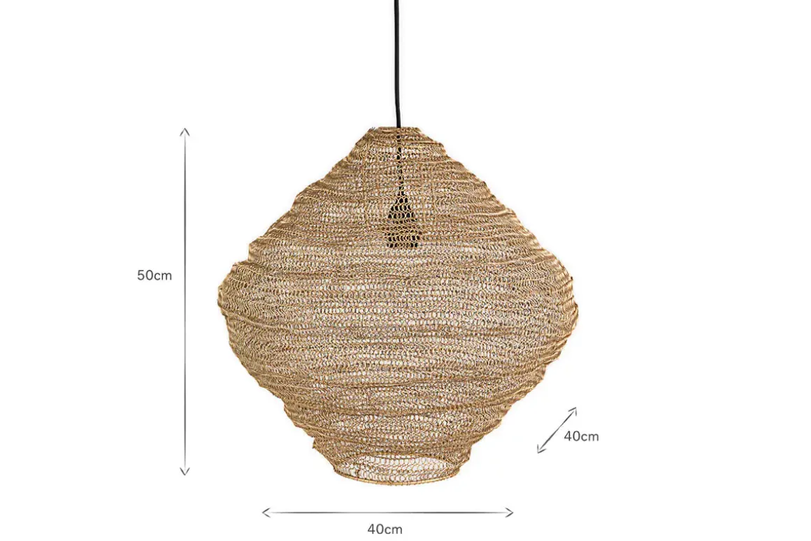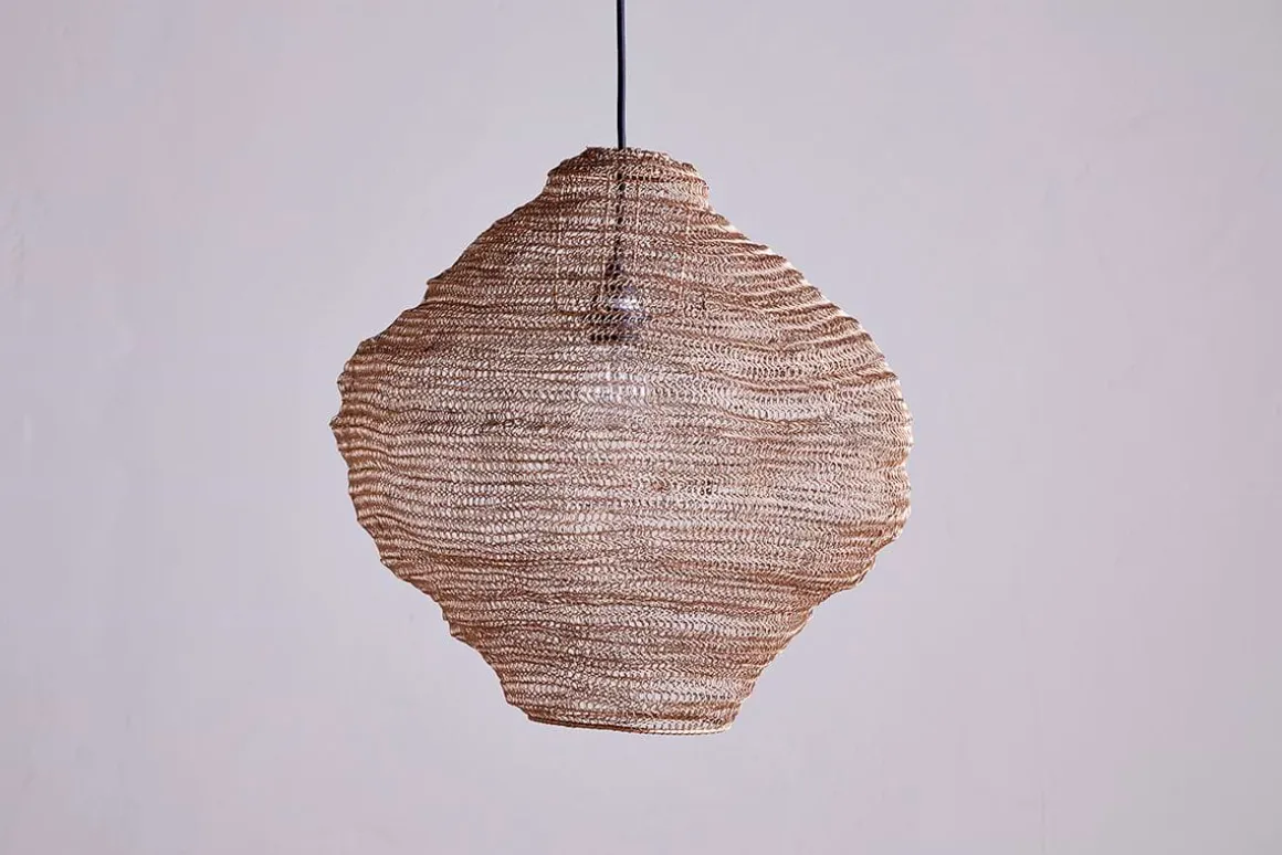 Hand-sculpted from wire in a striking organic shape, our Mukuni wire lampshade has a linked design which is beautifully complemented by an attractive brass finish. This unique combination of soft curves and industrial elements, style and texture, adds character to any space. The carefully crafted weaves allow light to diffuse gently, creating a warm and inviting atmosphere. Ideal for your living area or workspace, the Mukuni lampshade brings modern elegance to your decor. Available in large.